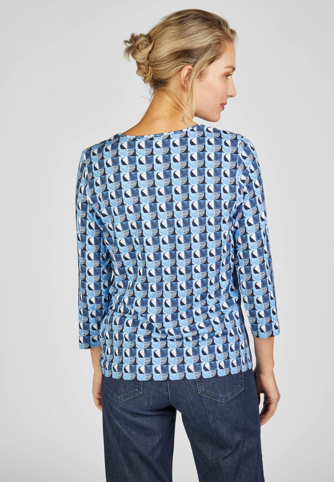 Футболка с рукавами 3/4 впечатляет стильным узором в клетку различных оттенков синего, подчеркнутым белыми бликами. Длина спинки от плеча для 44 размера: 62 см.