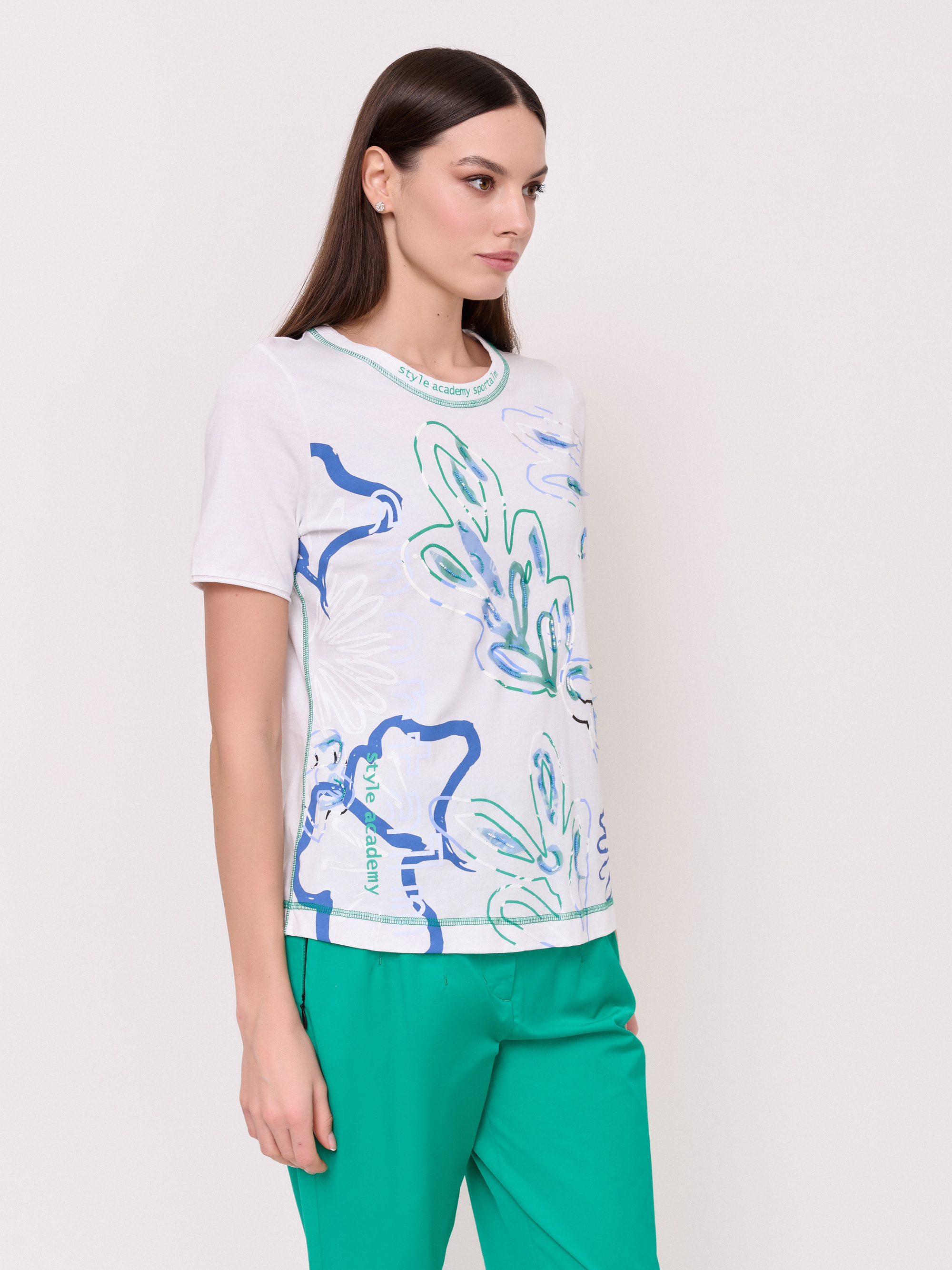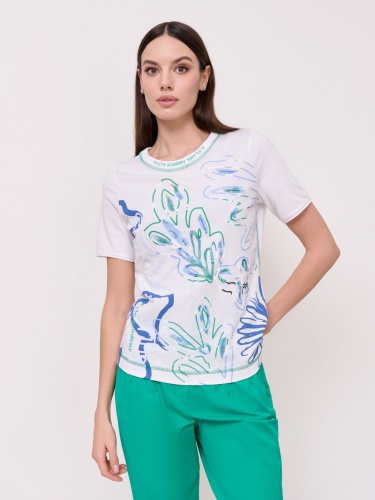 Детали: вырез горловины округлый, покрой полуприталенный, рисунок цветы и растения, наличие надписи с надписью, вышивка бисером, аплликации. Длина по спинке: 59 см.