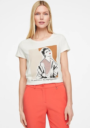 Однотонная футболка с принтом – необходимый элемент капсульного гардероба, отлично сочетается как с джинсами и брюками, так и с юбками, как самостоятельный верх или под пиджак. Круглый вырез горловины, короткий втачной рукав.