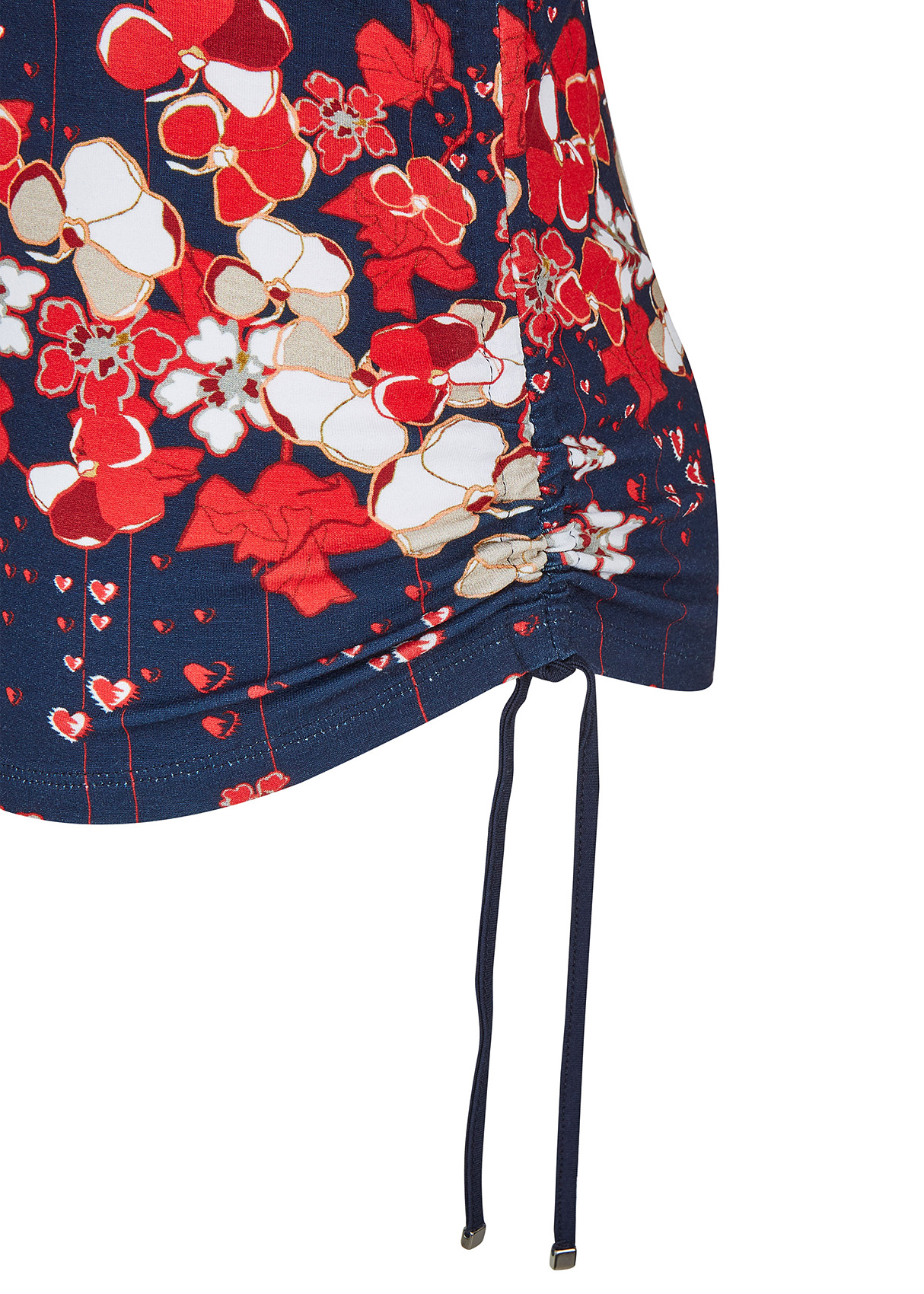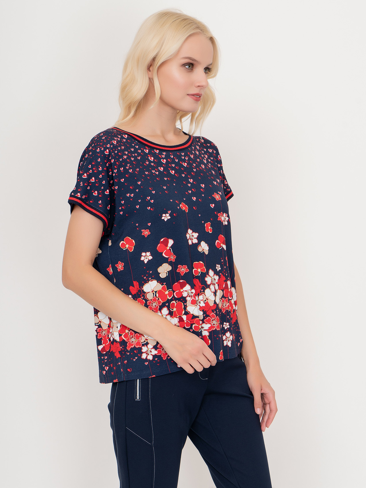 Эта футболка привлекает внимание контрастным принтом. Полуприлегающий силуэт. Круглый вырез горловины и короткие цельнокроеные рукава обработаны контрастной обтачкой в полоску. Еще одна особенность дизайна - кулиска в левом боковом шве, что позволяет регулировать длину и создать красивые драпировки. Приятный к телу материал из вискозной смеси обеспечивает комфорт в ношении.