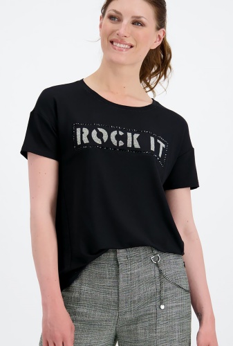 Черная футболка свободного кроя идеально сгладит недостатки фигуры и подчеркнет достоинства. Принт-надпись на груди делают футболку отличной составляющей современного кэжуал-стиля. Футболка имеет втачной короткий рукав со спущенным плечом.