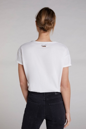 Свобода в тренде! Футболка свободного покроя. Широкий круглый вырез горловины, короткие рукава со спущенным плечом. Стильный акцент в дизайне - украшенный стразами принт. Хлопковый материал приятен к телу и обеспечивает комфорт. Эта модель - замечательная основа для создания образов в стиле кэжуал.