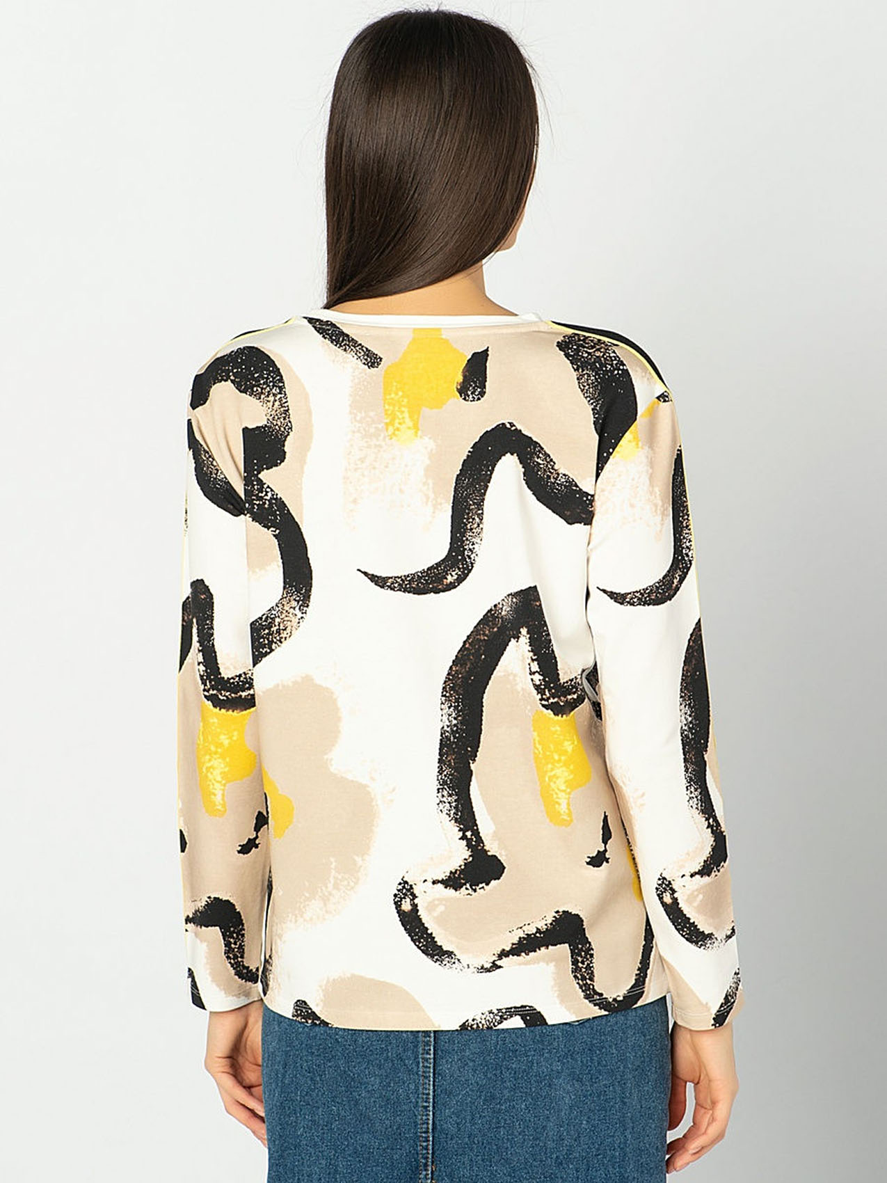 Футболка-лонгслив. Трендовый абстрактный принт. Слегка приталенный силуэт. Декоративная лента на плечах и рукавах. Материал из смеси хлопка, модала и эластана обеспечивает комфорт. Длина изделия по спинке: 65 см.
