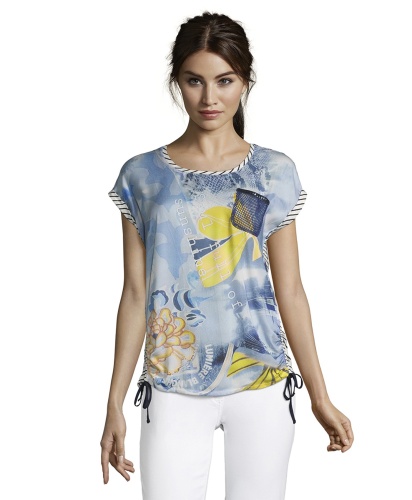 Топ прямого покроя. Круглый вырез горловины с обтачкой, короткие цельнокроеные рукава с фиксированными манжетами. Сочетание принтов и фактур непременно обратит на себя внимание. Абстрактный принт на переде изделия, принт в полоску - на спинке. Кулиски по бокам, декоративный карман на груди. Материал из вискозной смеси приятен к телу и обеспечивает комфорт. Эта женственная модель прекрасно смотрится с любым лаконичным вариантом низа.