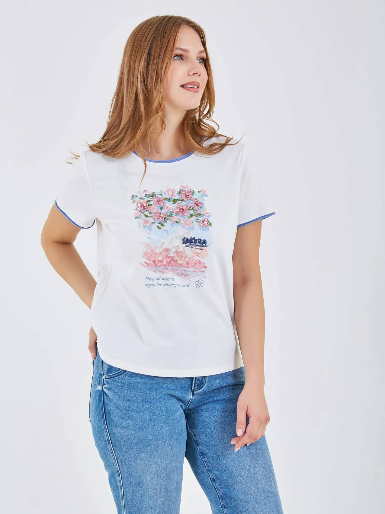 Футболка белого цвета с нежным цветочным принтом и изображением гор. Контрастные рукава и воротник голубого оттенка добавляют стильный акцент, идеально подходящий для повседневной носки. Коллекция Весна-Лето 2025. Капсула "Самарканд". Параметры модели: 95-64-101, рост 175, размер 44-46