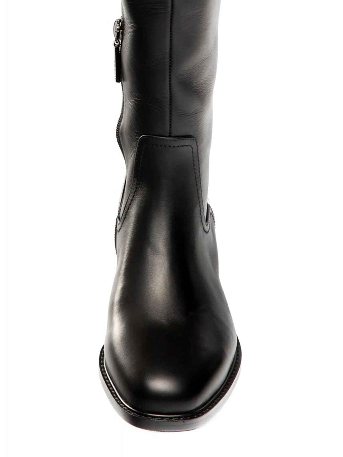Женские кожаные сапоги жокейского стиля на подкладке из байки. Декорированы кожаным ремешком с пряжкой. Молния 3/4 с внутренней стороны.