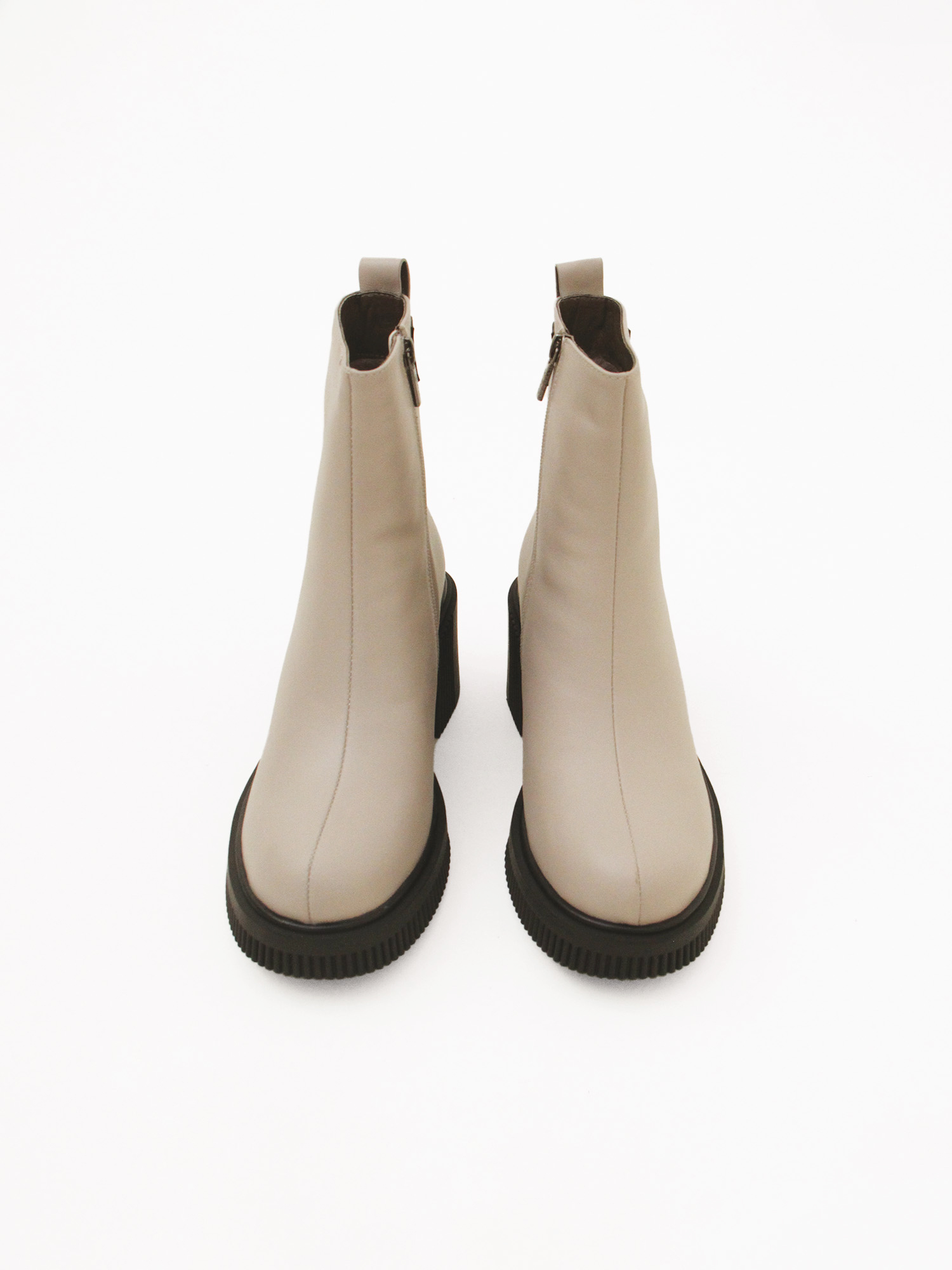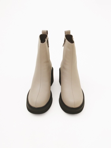 Демисезонные ботинки на толстом устойчивом каблуке и небольшой платформе. Верх полусапожек выполнен из натуральной кожи бледно-бежевого цвета. Обувь утеплена натуральным мехом.