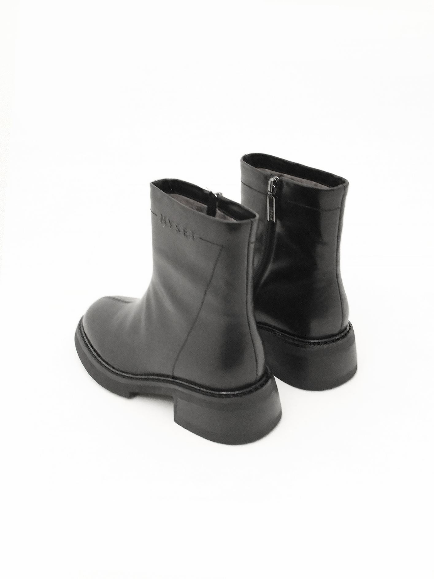 Трендовая, утепленная байкой модель, демисезонных ботинок из натуральной кожи на толстом устойчивом каблуке. На внешней стороне ботинок с помощью тиснения нанесено название бренда MYSET.