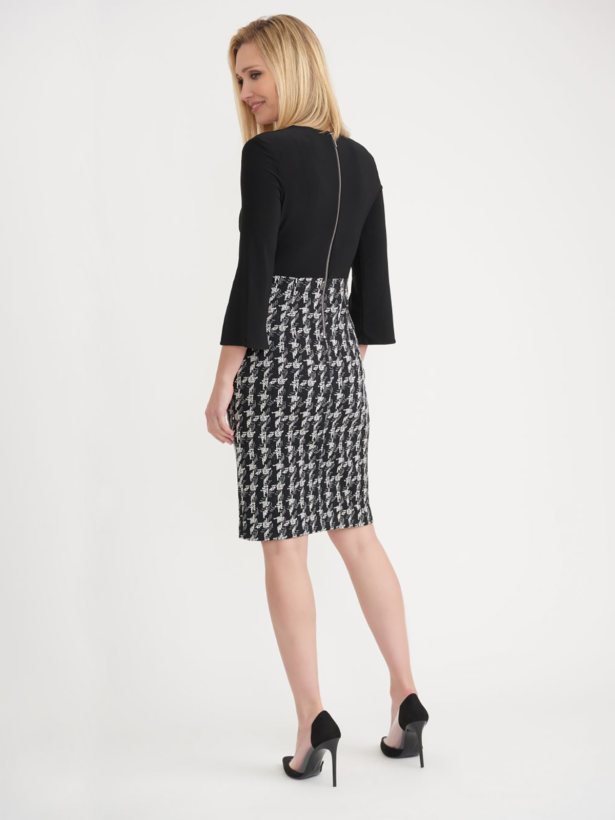 Платье миди с узором гусиная лапка на подоле изделия. Приталенный силуэт, длина ниже колена. V-образный вырез горловины, втачной рукав 3/4.