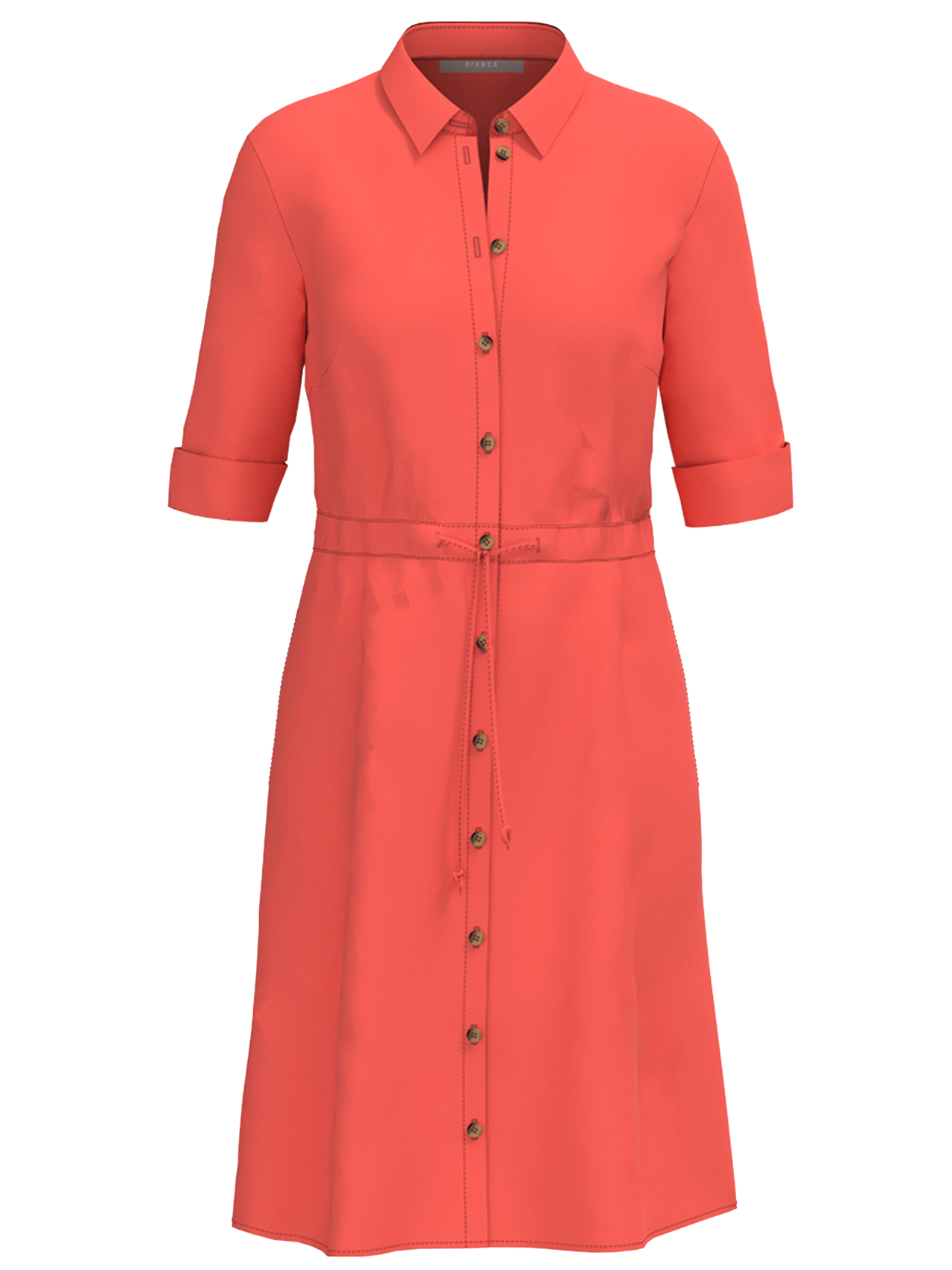 Однотонное платье в яркой расцветке идеально подходит для жаркой летней погоды. Кулиска на поясе позволяет сделать силуэт приталенным. Отложной рубашечный воротник, планка с контрастными пуговицами. Втачной рукав с подворотами.