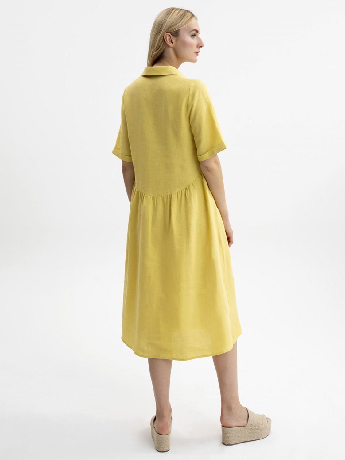 Хлопковое платье-рубашка свободного кроя. Длина миди. Отложной рубашечный воротник. Втачной рукав длиной до сгиба локтя. Застежка на пуговицы.