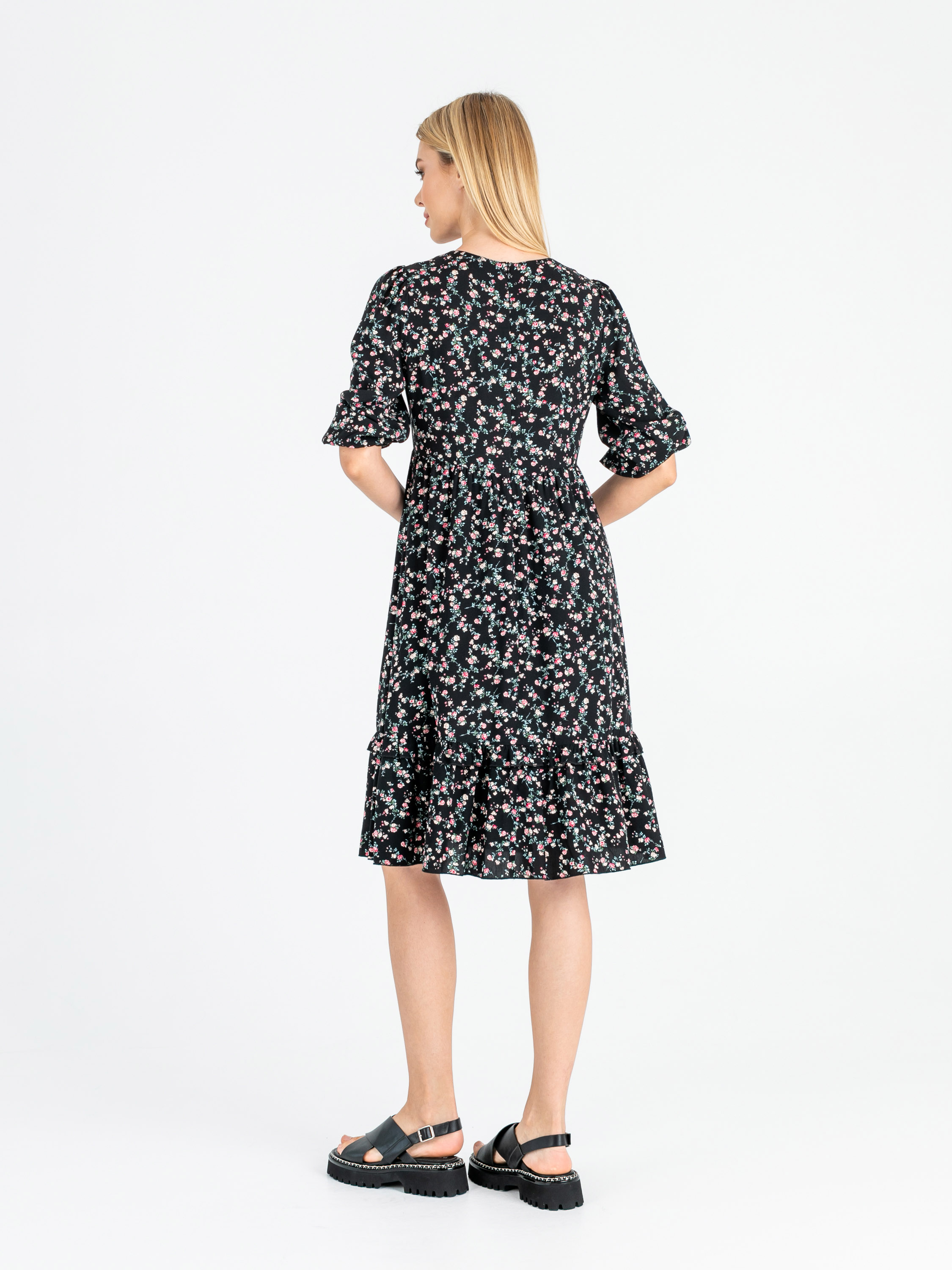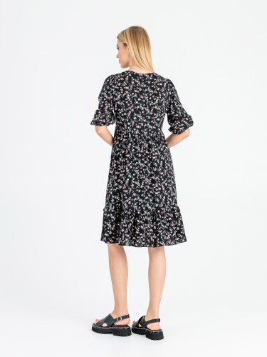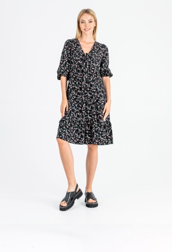 Приталенное платье с цветочным принтом. V-образный вырез с завязками. Рукав 2/4 на резинках.
