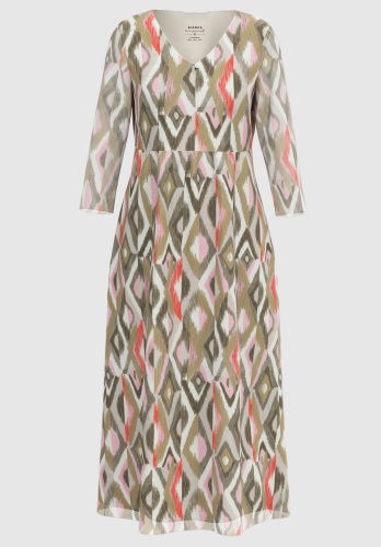На сайте указаны российские размеры. Платье макси с V-образным вырезом и прозрачными рукавами 3/4. Высококачественный полиэстер с эластаном, подкладка из джерси. Деталь с пуговицами на вырезе. Длина юбки около 78 см, рост нашей модели около 180 см.