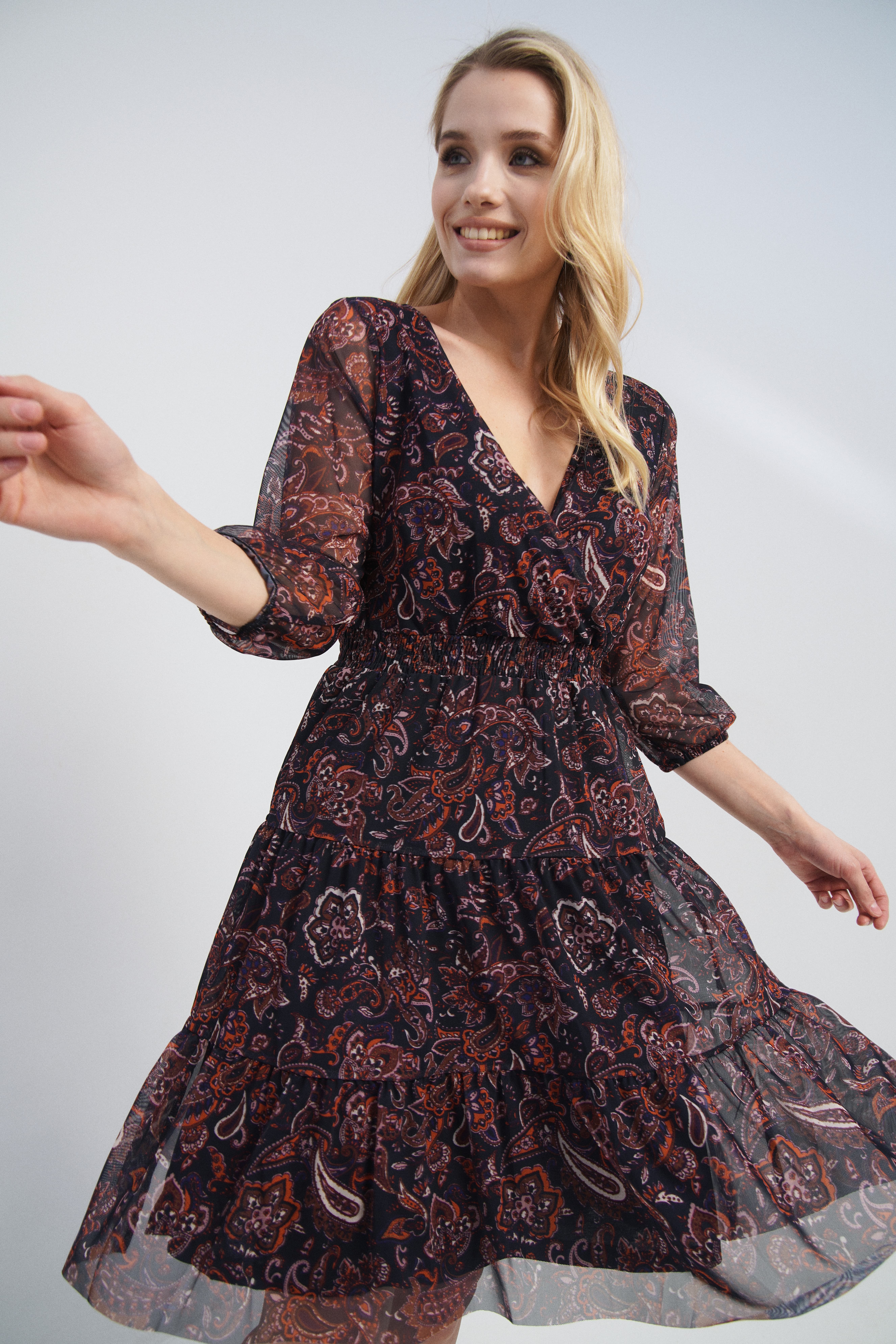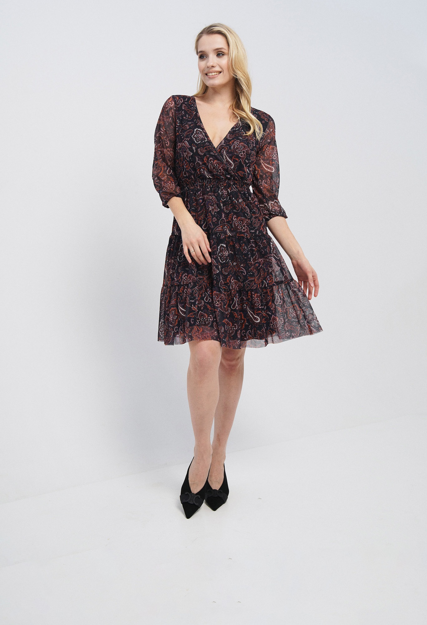 На сайте указаны российские размеры. Современное сетчатое платье от MORE & MORE с осенним принтом пейсли на темно-синем фоне. Узкий фасон вверху, расклешенный к низу. V-образный вырез и запах. Прозрачные рукава длиной 3/4 с резинкой по низу. Эластичный пояс. Юбка с широкими ярусами на подкладке из джерси. Длина в размере 42 = 96см