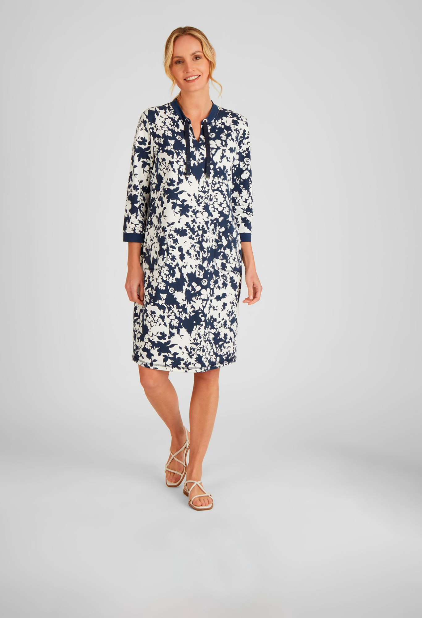 На сайте указаны российские размеры. Это платье прямой формы из хлопка сразу привлекает внимание своим абстрактным цветочным узором. Шнурок на воротнике и нашивные карманы придают платью спортивный вид. Рукава 3/4, накладные карманы, кулиска на воротнике. Рост модели 176 см. Длина по спинке от плеча для размера 46: 100 см.