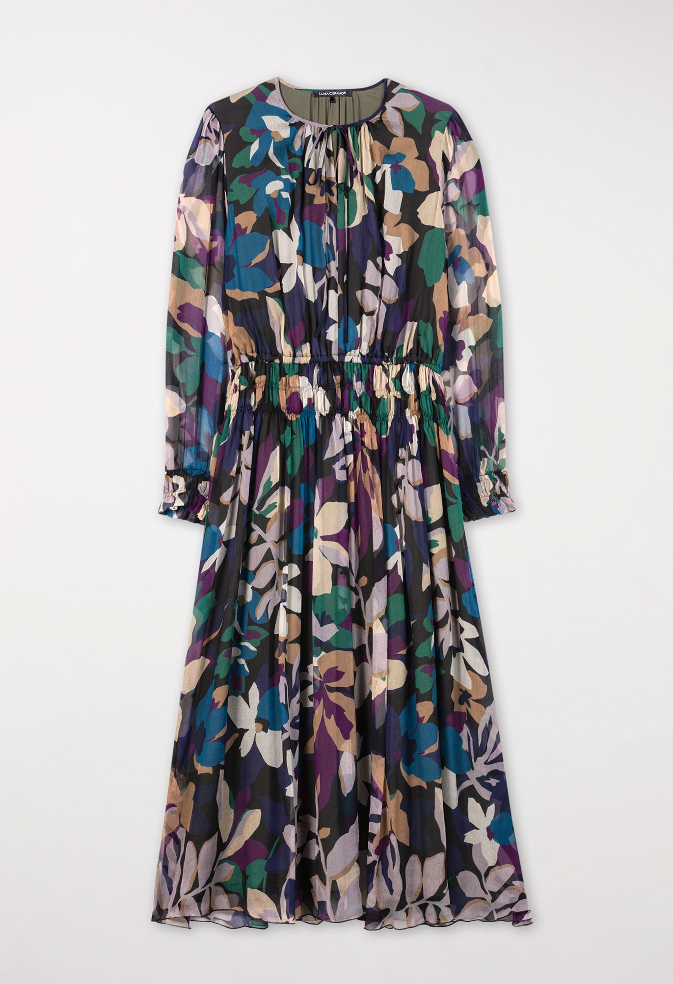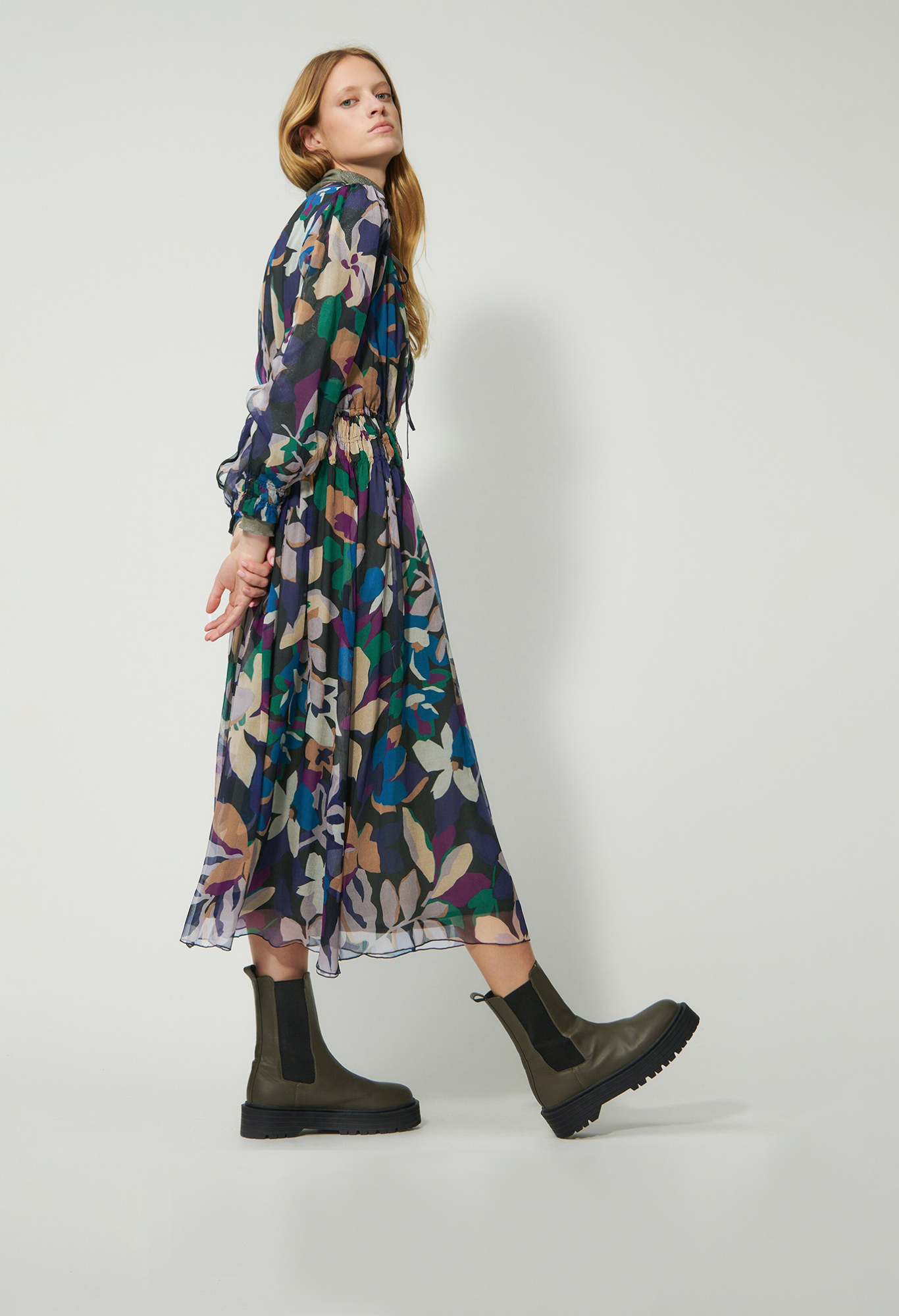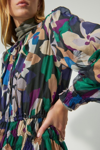 Платье на подкладке из струящегося шелкового крепа с эксклюзивным цветочным узором в зимних тонах. Круглый вырез горловины завязан лентой. Талия и манжеты украшены декоративной сборкой.