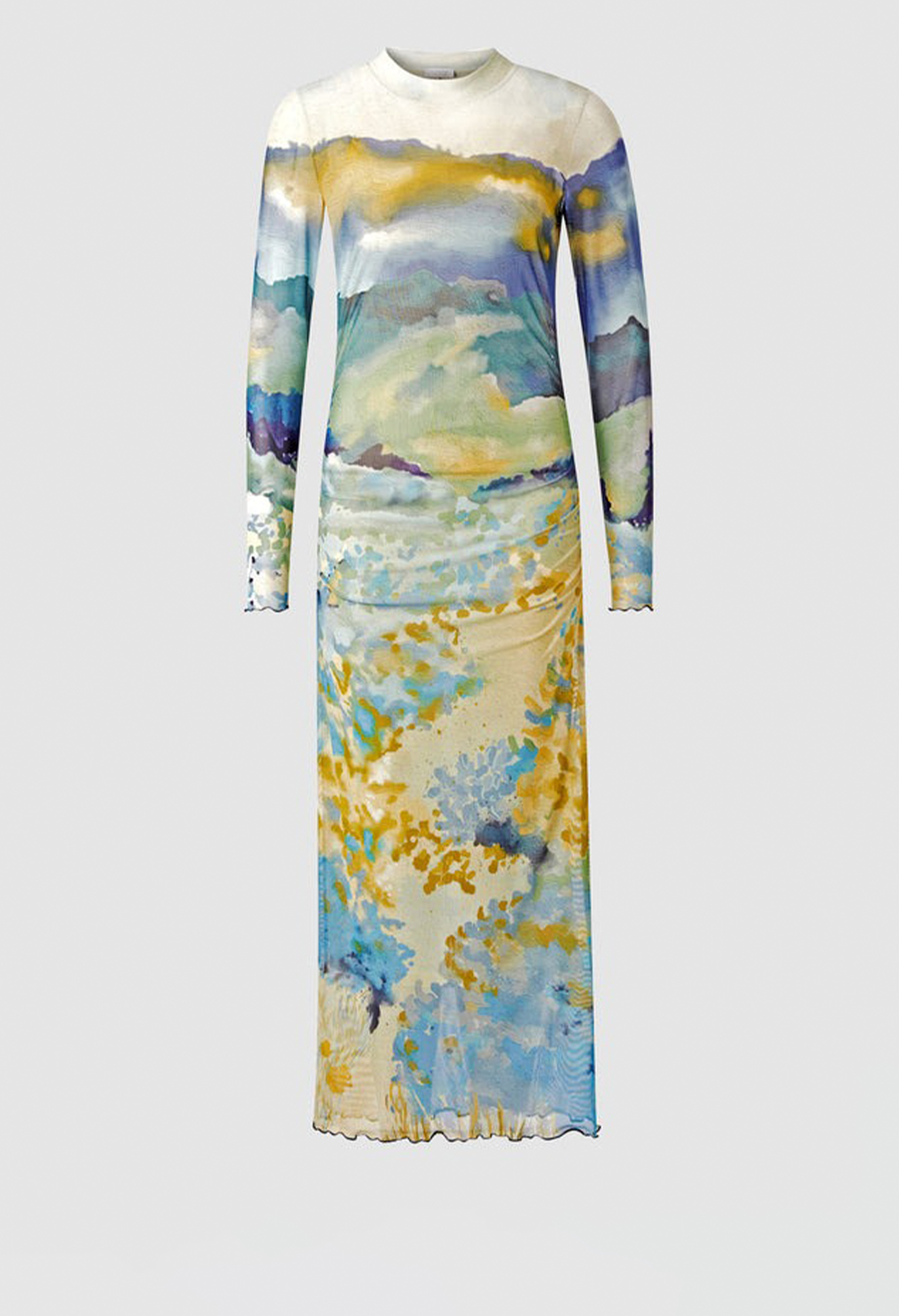 Облегающее фигуру платье украшено прозрачным, размытым пейзажным принтом. Оно изготовлено из переработанной сетки с внутренней подкладкой и необработанным краем. Оборки по бокам создают строгий силуэт. Длина для размера 42: 131 см. Окружность груди для размера 42: 64 см.