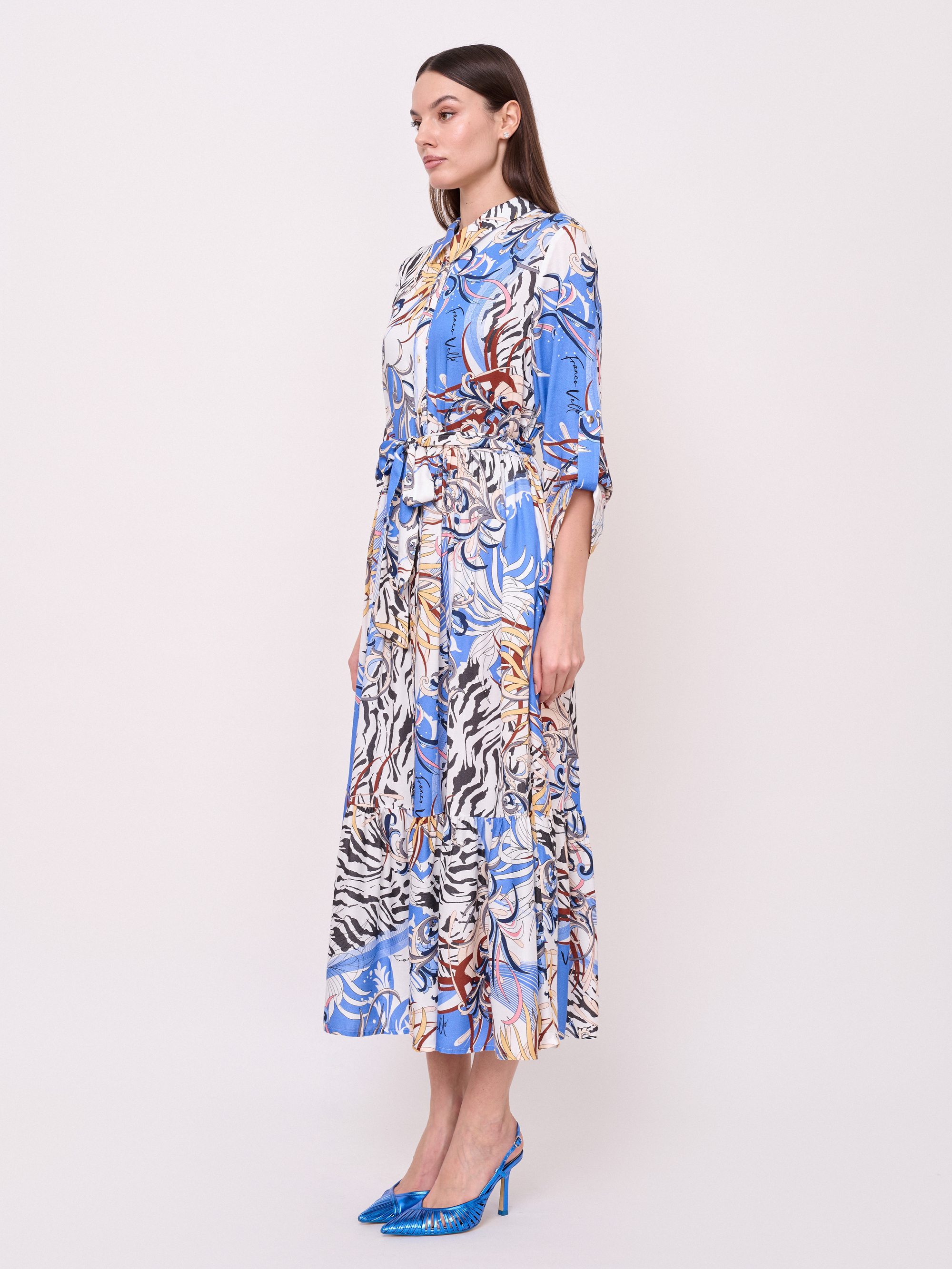Визкозная ткань, застежка пуговицы, вырез горловины отложной воротничок, рукава 7/8 с хлястиками на пуговице, покрой рубашечный, рисунок орнамент, карманы в шве, конструктивные элементы воланы, длина платья макси, пояс из основной ткани. Длина по спинке: 126 см.