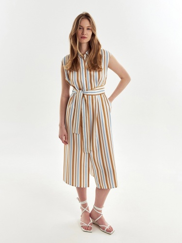 Прямое платье из вискозной ткани в разноцветную полоску с отложным воротником и глубокими складками на плечах. Платье с планкой на пуговицах до груди, от груди складка. В комплект входит пояс из основной ткани. В боковых швах карманы.
