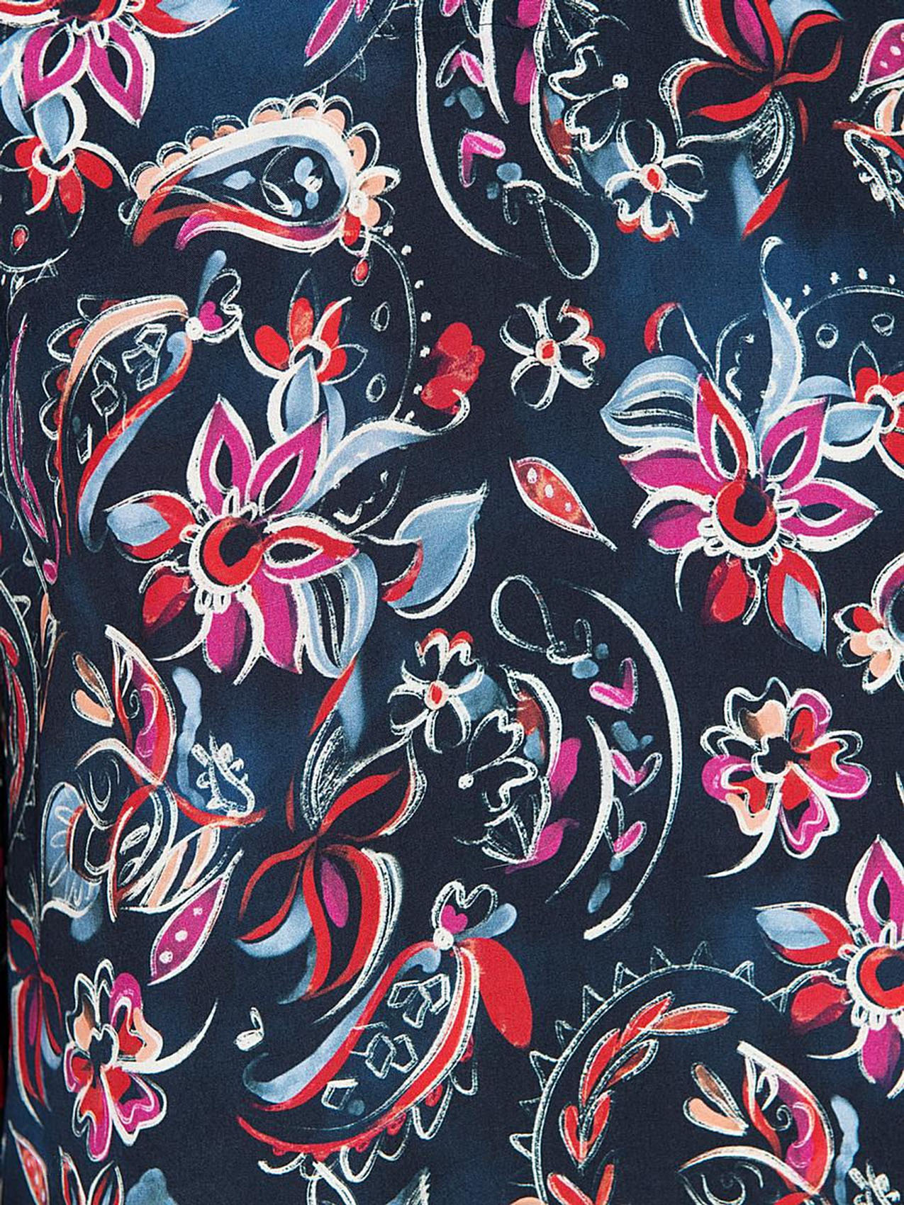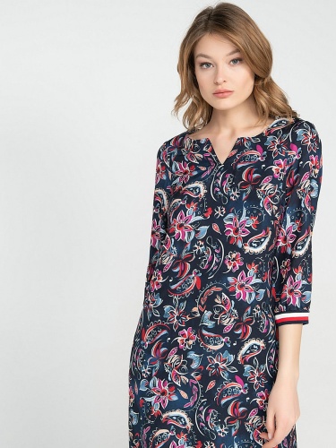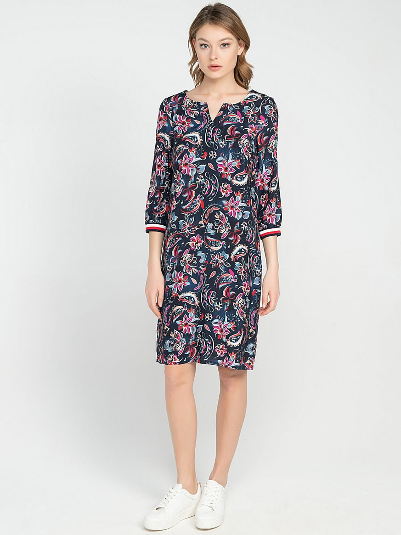 Платье с контрастным цветочным принтом - то, что нужно для летнего образа! Вискозный материал приятен к телу, а прямой покрой обеспечивает максимальный комфорт. Рукава 3/4 оканчиваются трикотажными манжетами. Завершенность дизайну придает фигурный вырез горловины. Стильное платье в сочетании со спортивной обувью создает современный образ. Длина изделия по спинке - 98 см.