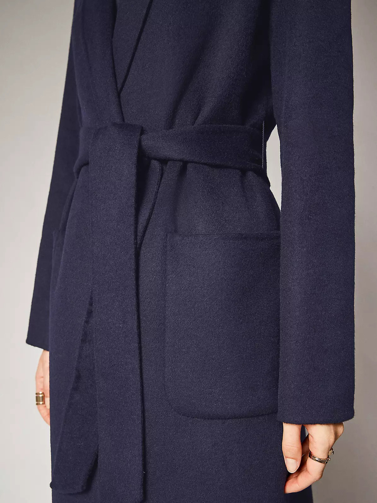Драповое пальто-халат с отложным воротником с лацканами. В комплекте идет пояс из основного материала изделия. Накладные карманы.
