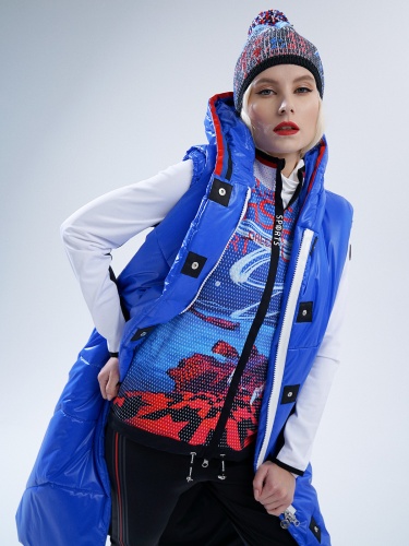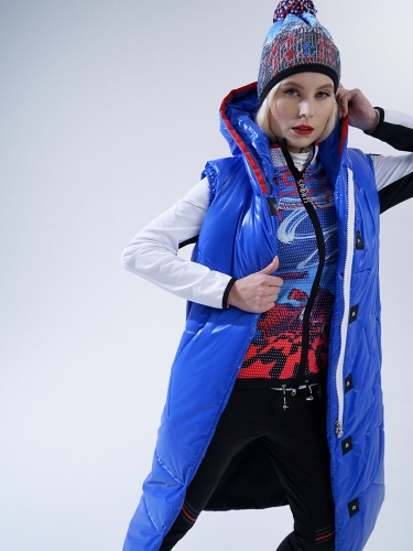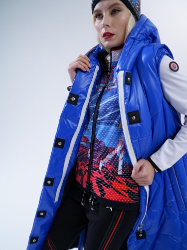 Удлиненный стеганый жилет ярко-синего цвета – теплый и стильный элемент аутфита. Подойдет для образов в спортивном или повседневном стиле, а также для образов спорт-шик. Застежка на контрастную молнию и клепки. Объемный капюшон защищает от ветра.