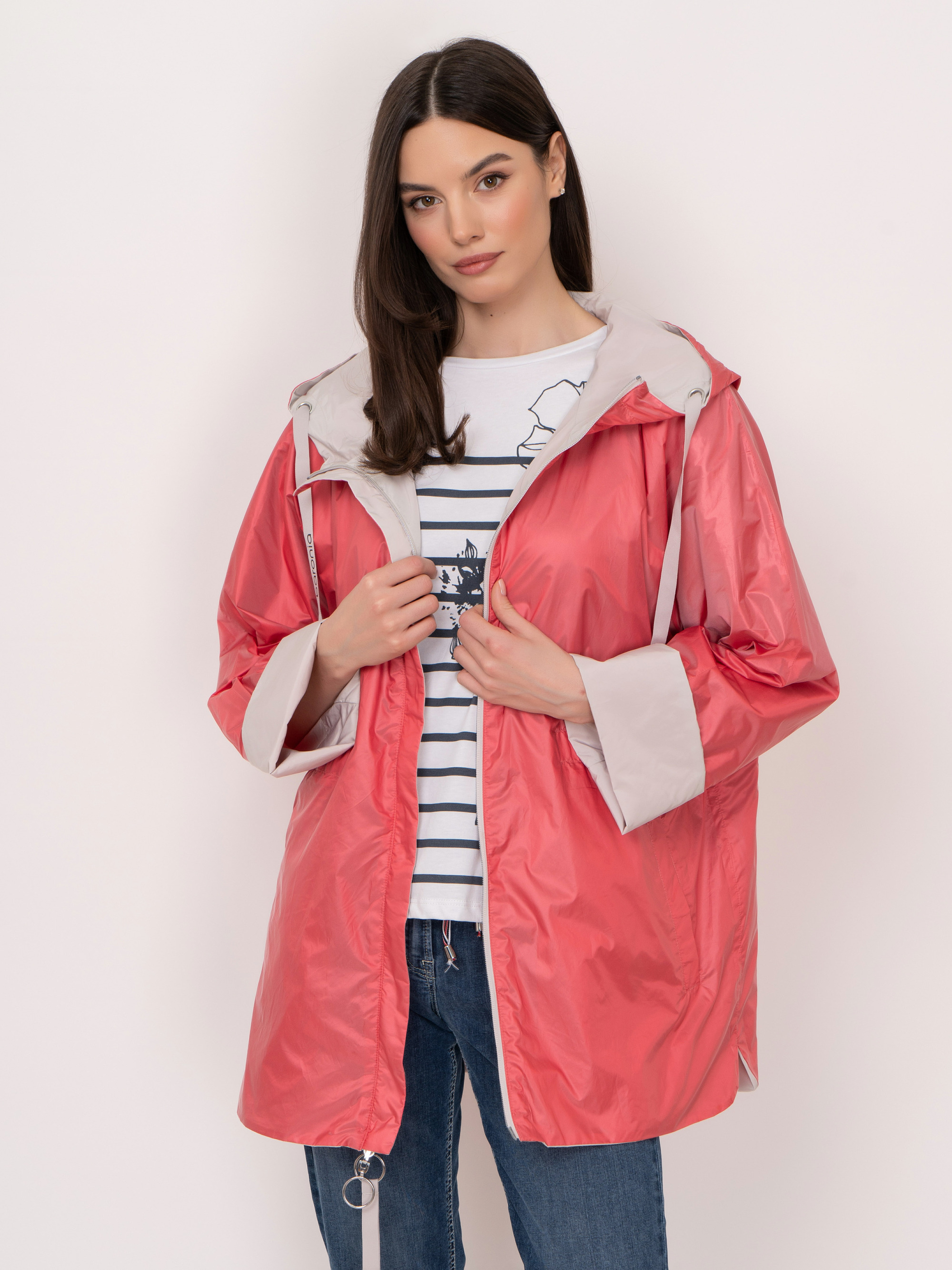 На сайте указаны российские размеры. Легкая двусторонняя куртка розового цвета, которую можно носить с обеих сторон. 2 боковых кармана на молнии. Регулировка талии кулиской. Рост модели: 175 см. Длина куртки: 76 см.
