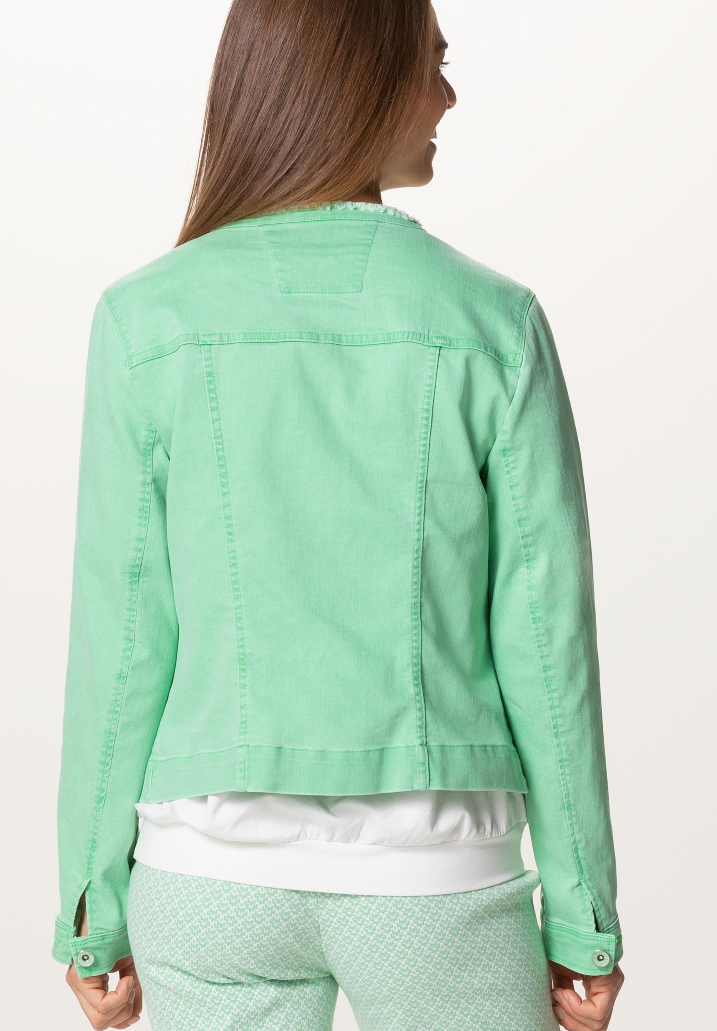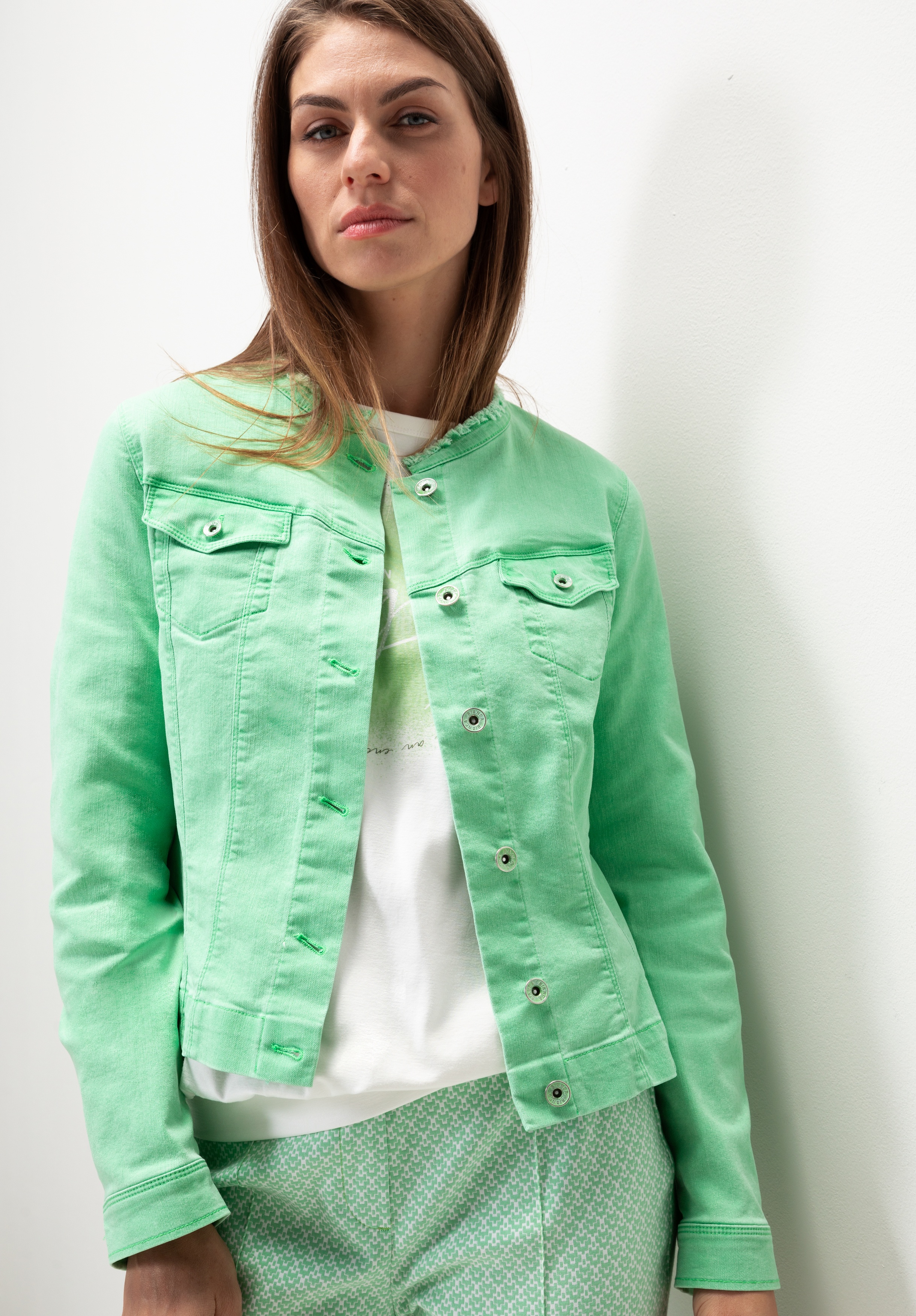 На сайте указаны российские размеры. Джинсовая куртка с особым воротником с бахромой. Благодаря сочетанию высококачественных материалов с эластичным эластаном, она очень удобна в носке и повторяет каждое движение. Планка на пуговицах спереди и особый воротник с бахромой, а также накладные нагрудные карманы делают эту модель абсолютно привлекательной. Длина в размере 44 около 54 см.