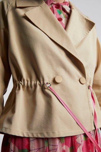 Двубортный жакет в спортивном повседневном стиле. Большой лацкан и контрастная цветная завязка на талии привлекают внимание. Широкие рукава реглан красиво завершаются эластичными вставками.