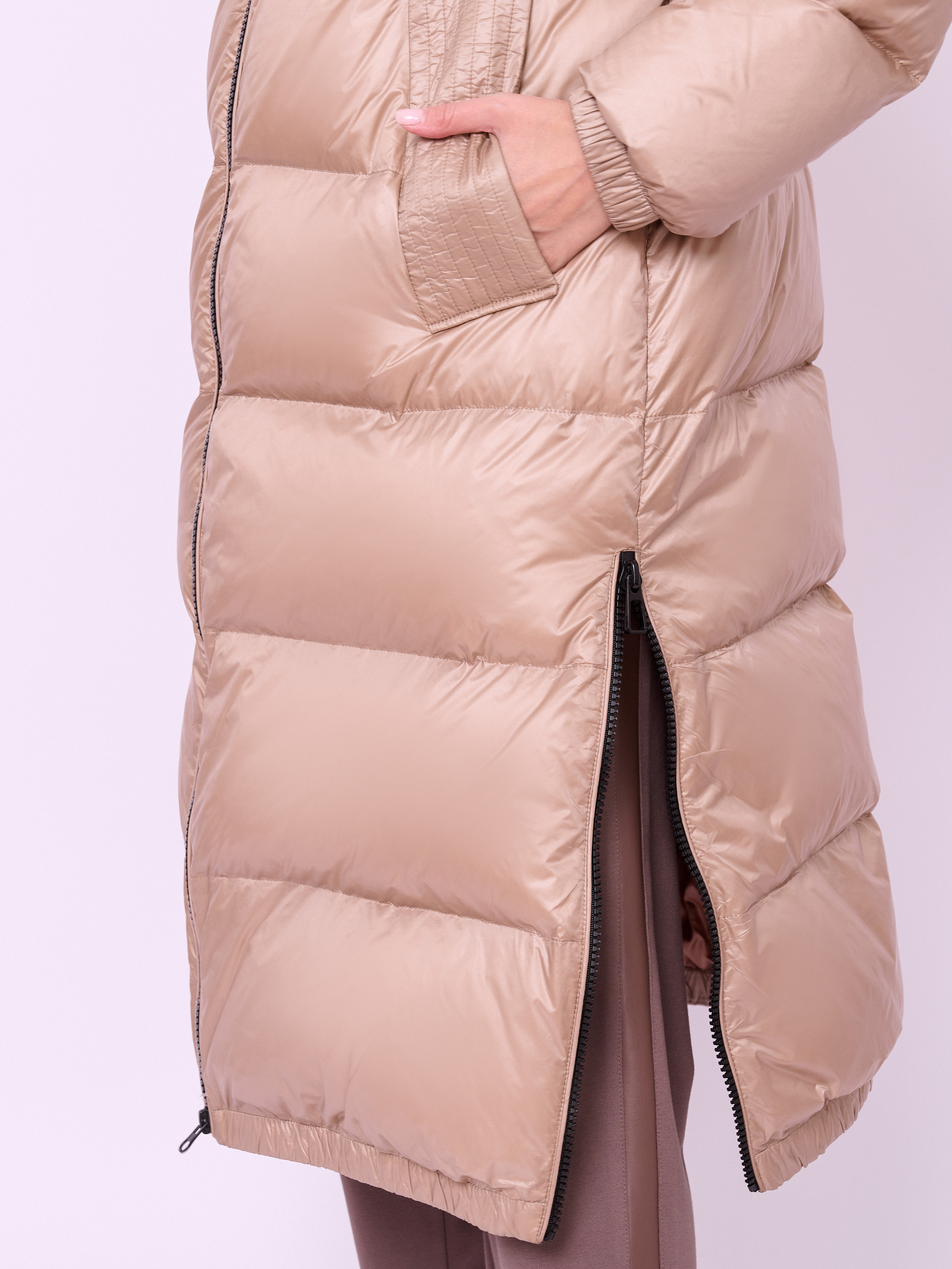 Пальто-пуховик стеганое с высоким воротом, несъемным капюшоном на кулиске без опушки, с длинными рукавами на резинке, прорезными карманами на магнитной кнопке, высокими разрезами на молнии и низом на резинке. Длина по спине: 112 см
