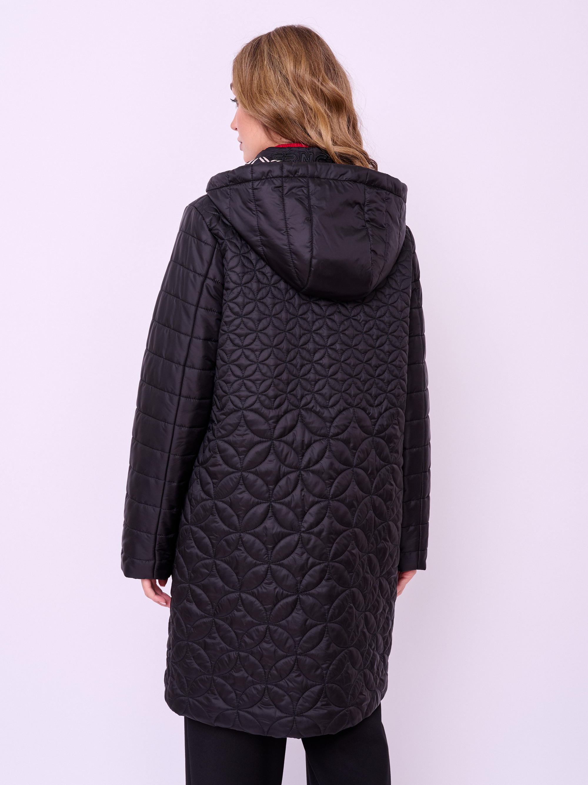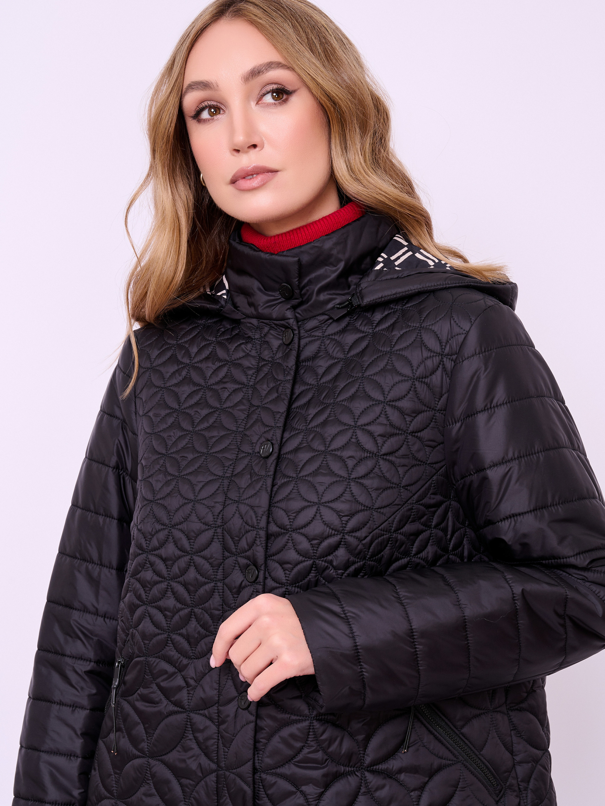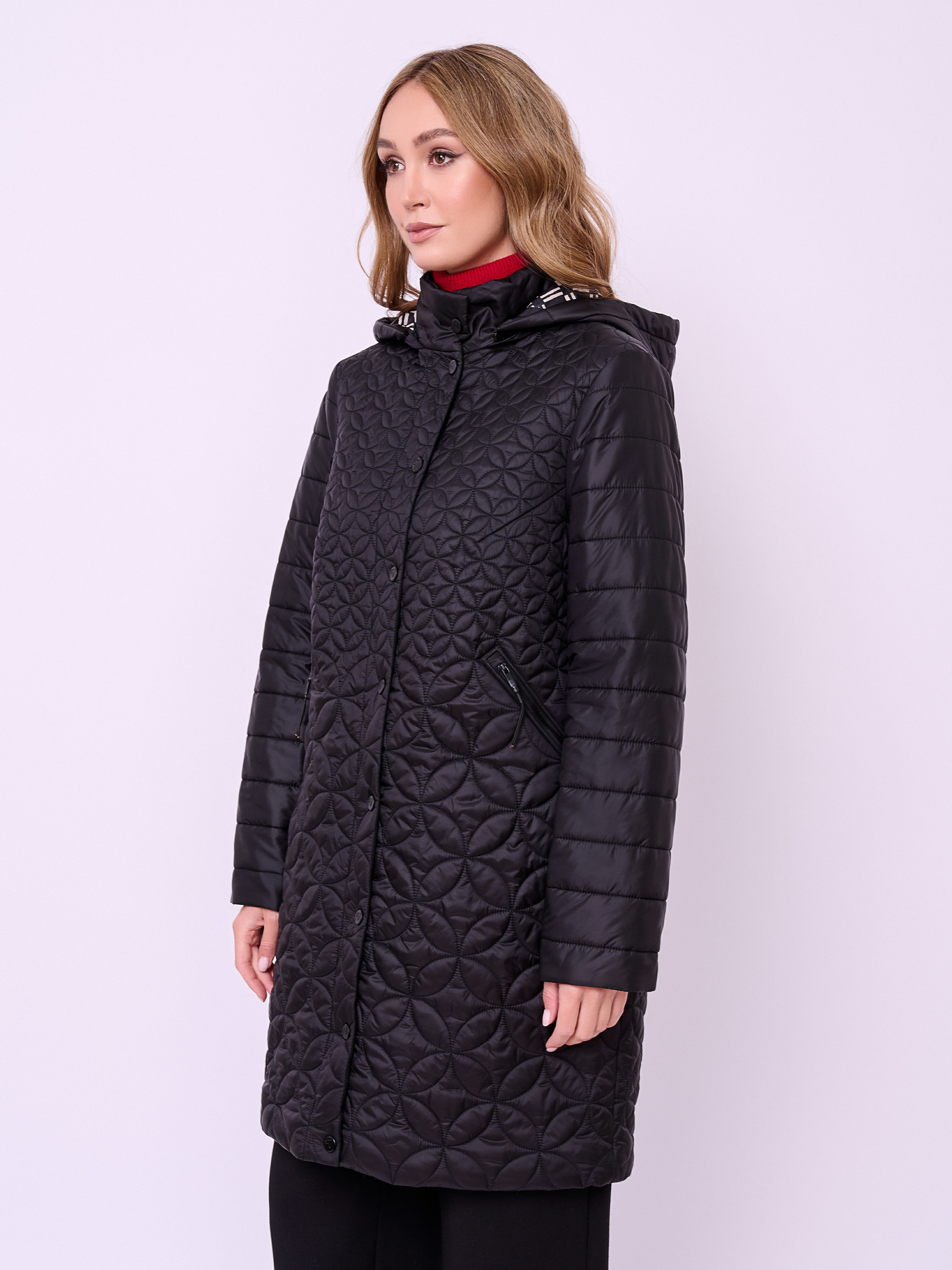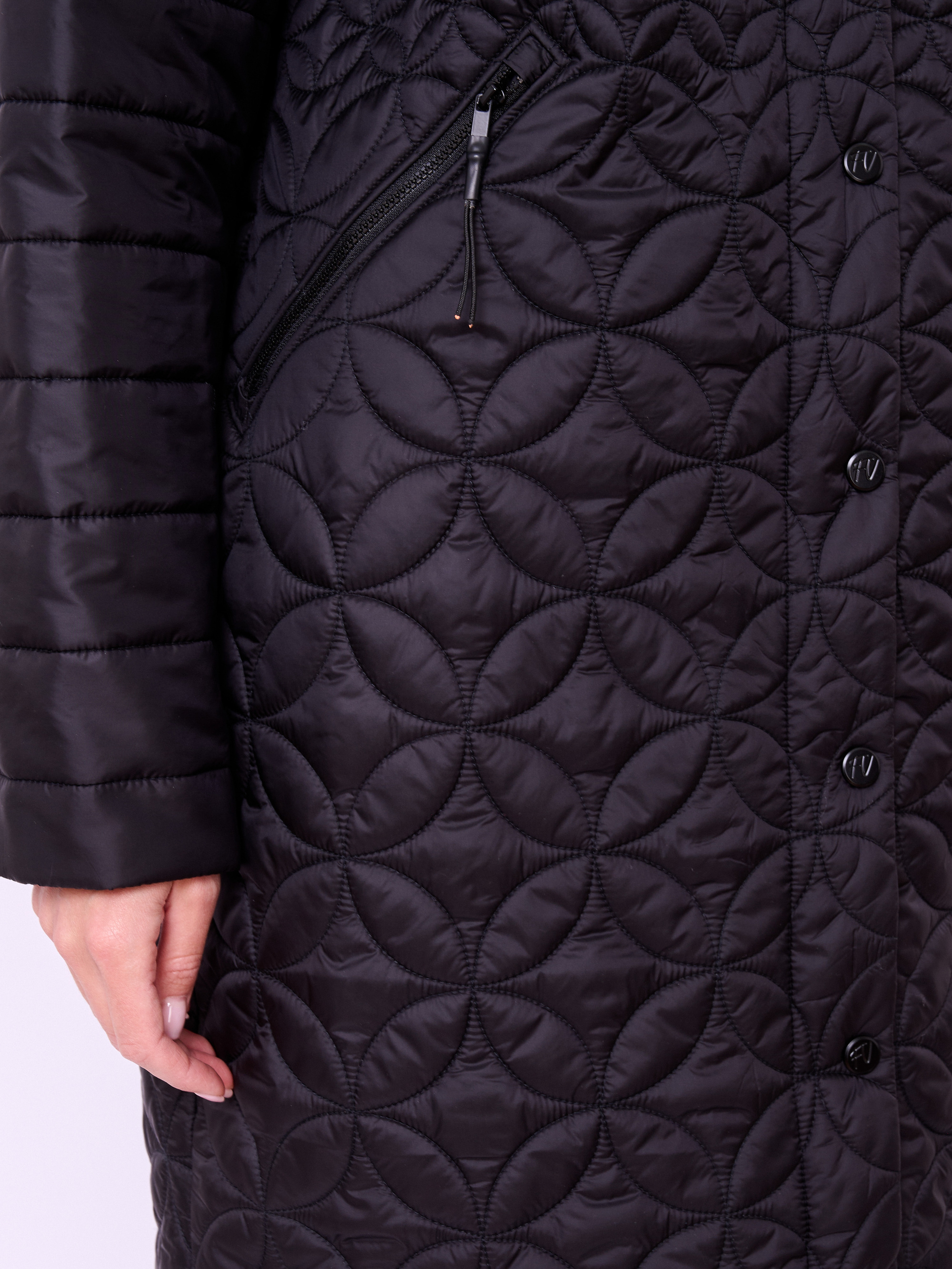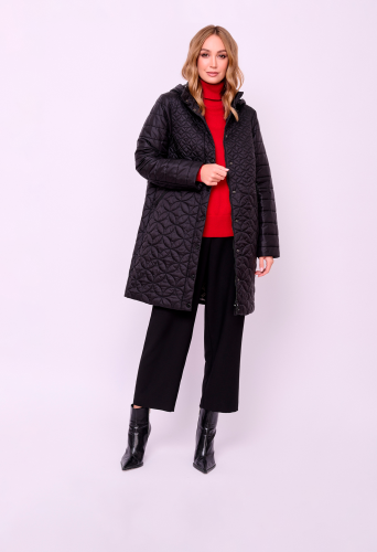 Утепленное стеганое пальто средней длины на молнии со съемным капюшоном, длинными рукавами и прорезными карманами на молнии. Длина по спинке: 90 см. Плотность утеплителя: 100