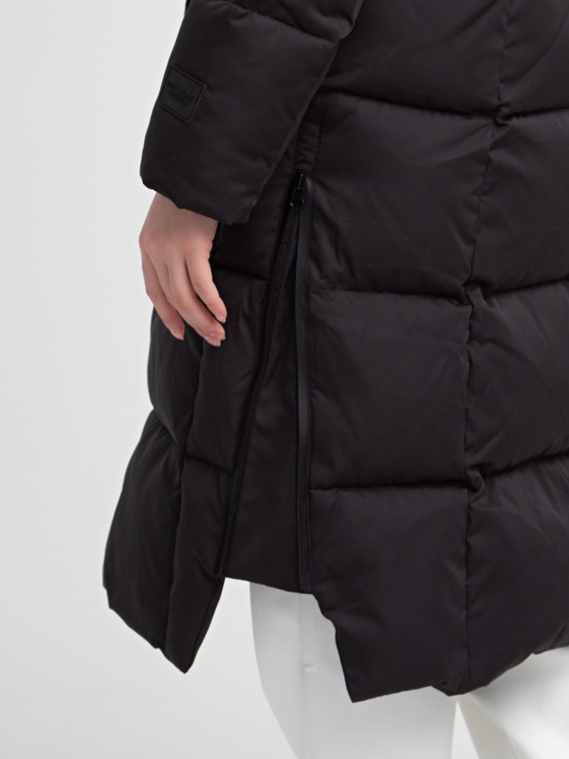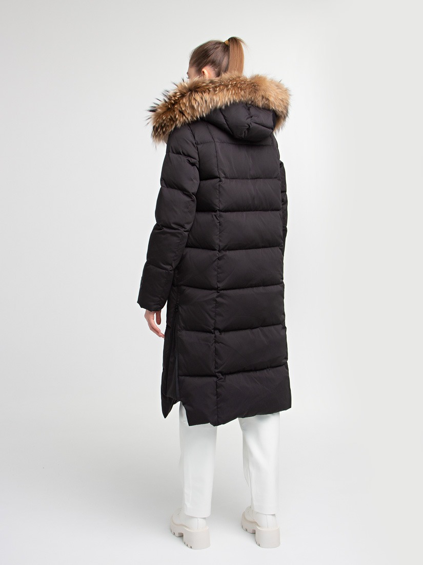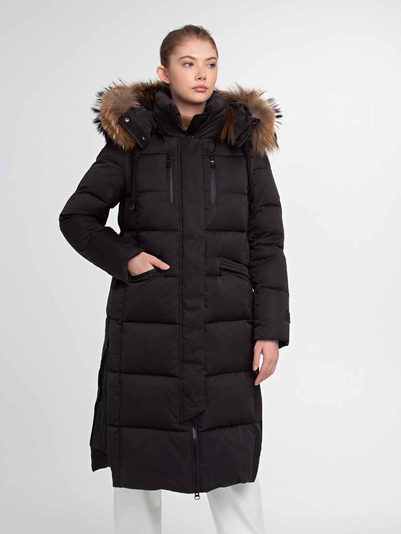 Парка средней длины изготовлена из плотного матового не продуваемого полиэстера. Изделие утеплили легким био-пухом. Глубокий отстегивающийся капюшон со съемной отделкой из меха енота не оставит шансов ветру. За дополнительный комфорт отвечают широкая планка, теплые карманы и внутренние трикотажные ветрозащитные манжеты. Пуховик декорирован фактурными лентами черного цвета, которые дополнительно усиливают кнопки. Длина: 106 см. Утеплитель: 290 грамм/м2
