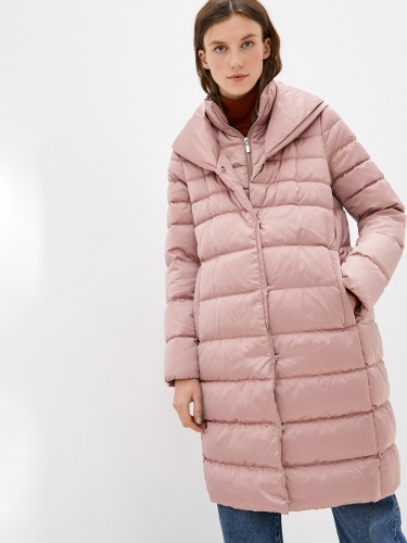 Однотонные зимнее пальто в пыльно-розовой расцветке. Натуральный пуховый наполнитель с добавлением пера. Застежка на молнию, ветрозащитная планка. Воротник стойка. Два боковых кармана с листочкой, плюс внутренний карман.