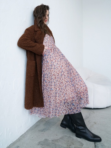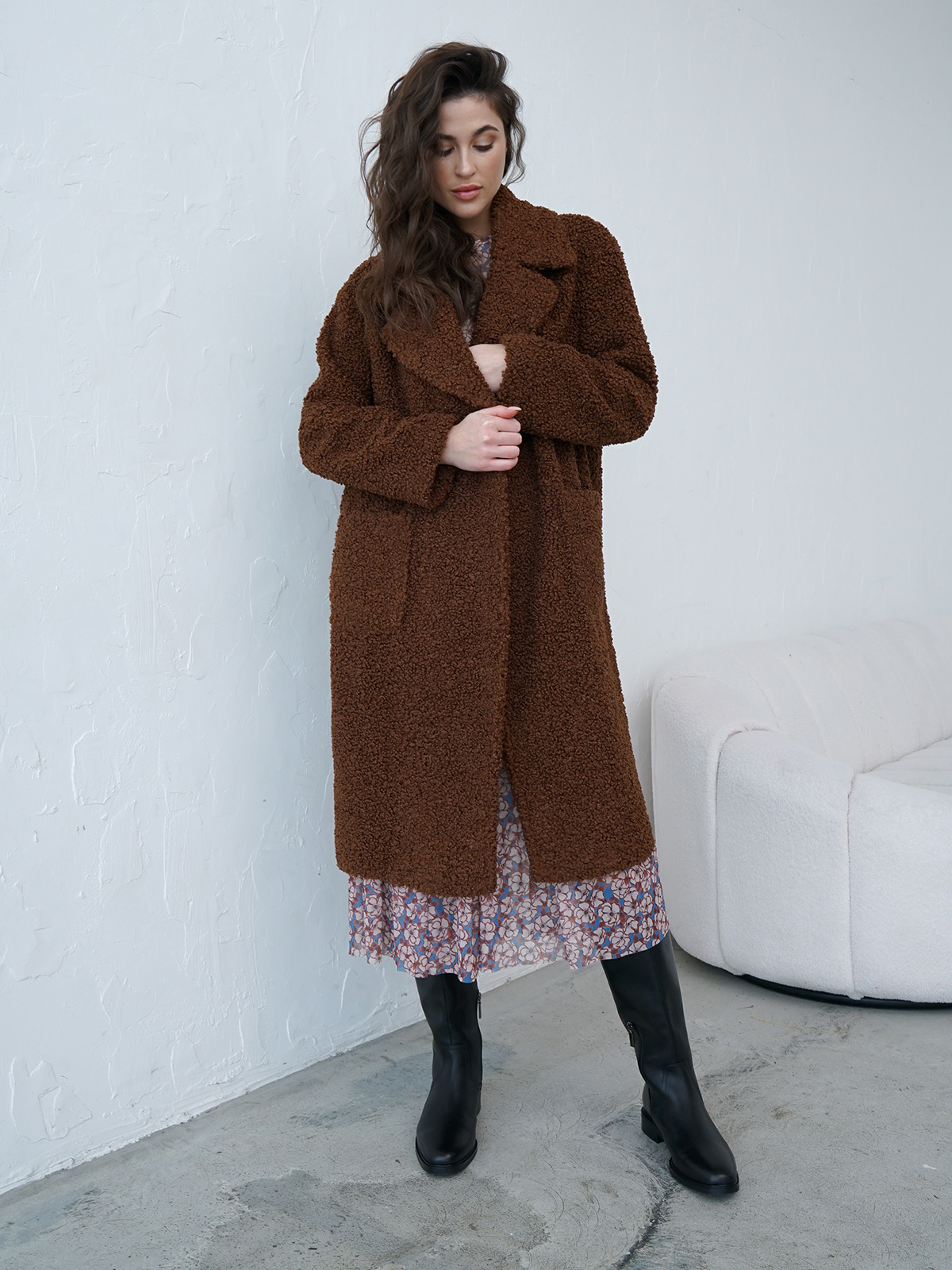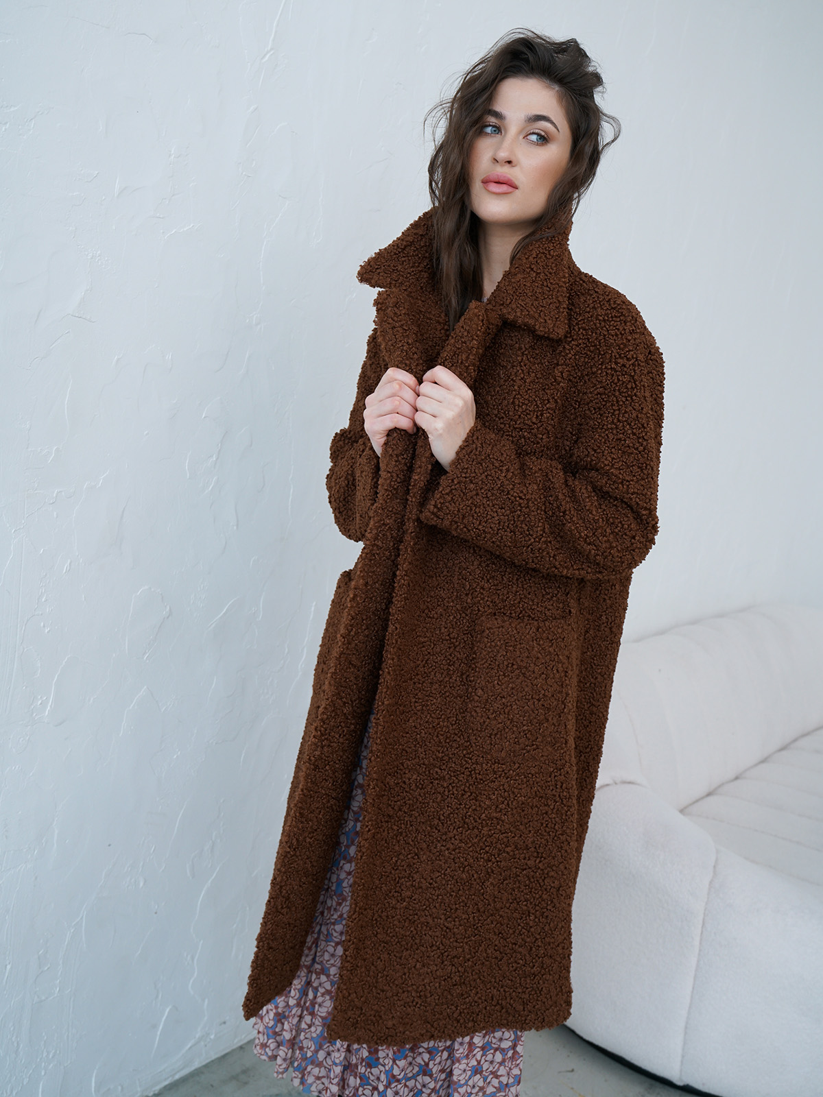 Пальто свободного кроя создано из однотонного искусственного меха. Классический воротник с лацканами, накладные карманы, застежка на пуговицы.