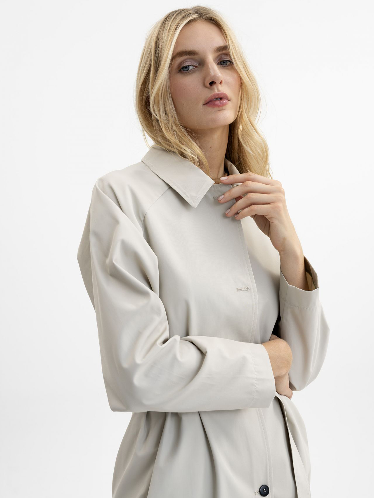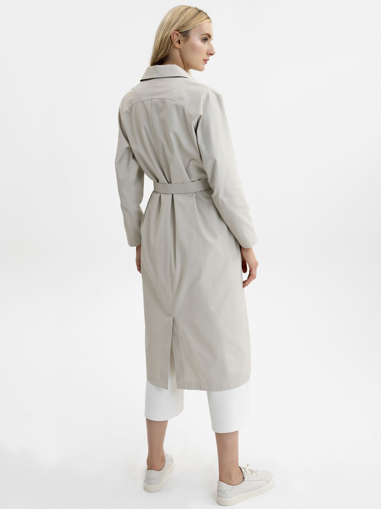 Однотонный легкий тренч на пуговицах. Рукава реглан полной длины. Отложной рубашечный воротник. В комплекте идет пояс из основного материала изделия.