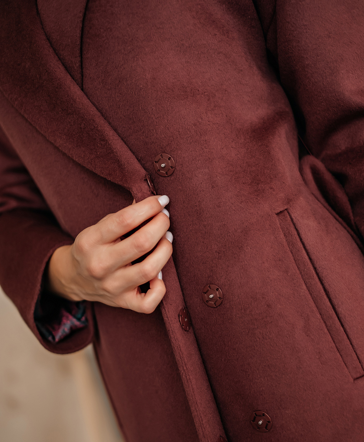Пальто прямого силуэта длиной выше колена. Втачной рукав, застёжка на пришивные кнопки, английский воротник, горизонтальный подрез на полочке и спинке, вертикальные карманы-листочки.