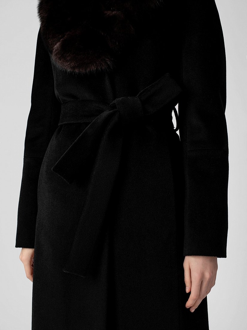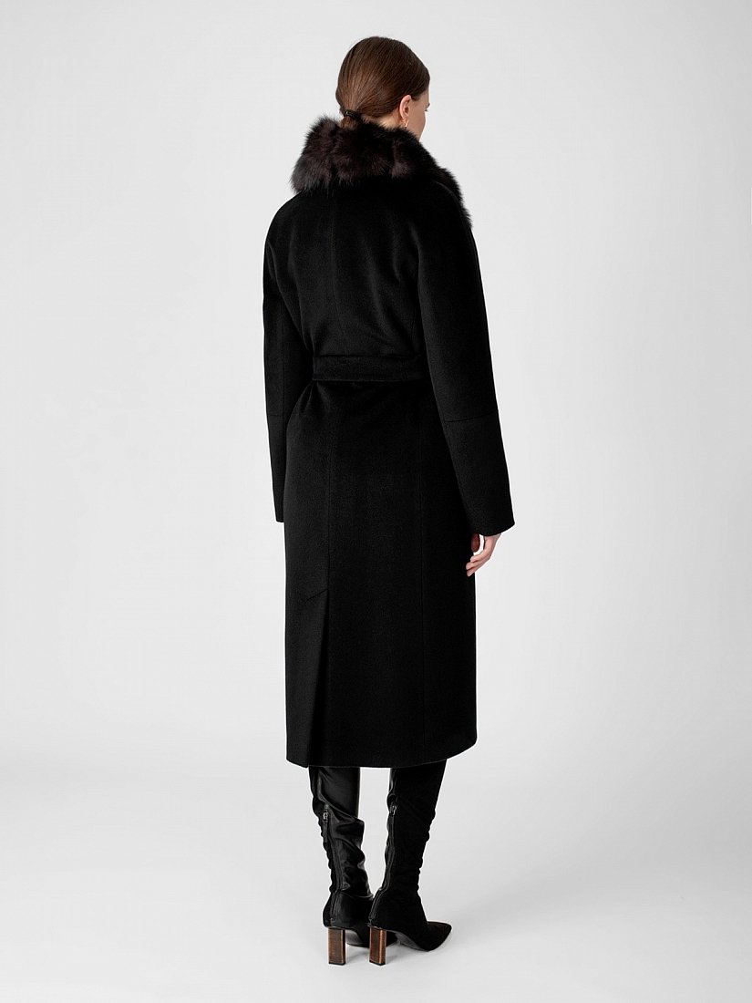 Пальто прилегающего силуэта из шерстяной ворсовой ткани чёрного цвета со съёмным воротником из натурального песца в росшив. Длина ниже колена. Рукава-кимоно с подрезом по низу, застёжка на пришивные кнопки, карманы в рельефах, английский воротник, пояс, шлица в среднем шве спинки. Произведено с ветрозащитной мембраной Raft Pro. Утеплитель DuPont Sorona из биопуха.