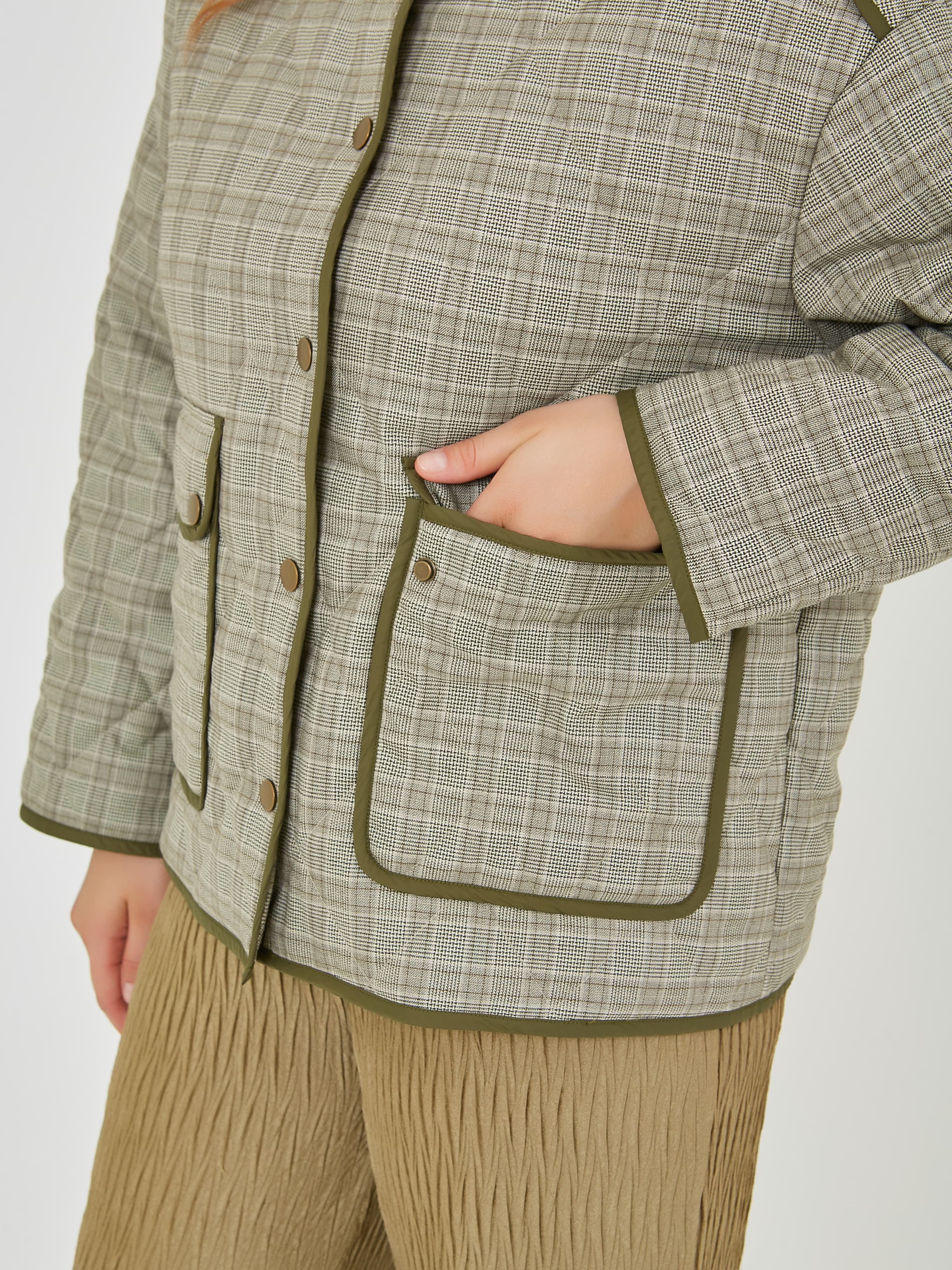 Куртка имеет стильный клетчатый узор в зеленых и серых тонах, что добавляет ей современный вид. Оформление с контрастной отделкой, застежками на кнопках и карманами придает ей функциональность и уют. Коллекция Весна-Лето 2025. Капсула "Марракеш". Параметры модели: 95-64-101, рост 175, размер 44-46