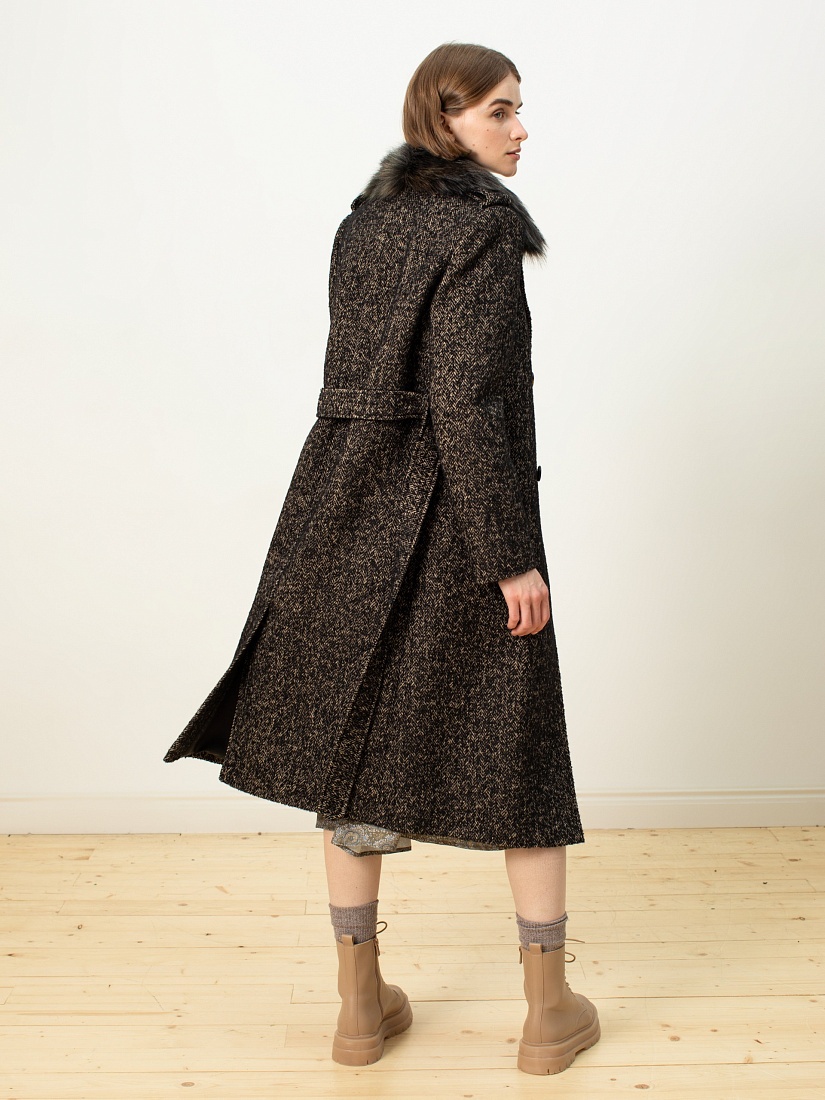 Двубортное пальто полуприлегающего силуэта из шерстяного твида со съемным воротником из искусственного енота. Втачной рукав, застёжка на роговые пуговицы, карманы с клапанами, пояс, шлица, погоны. Изделие декорировано широкой отделочной строчкой.