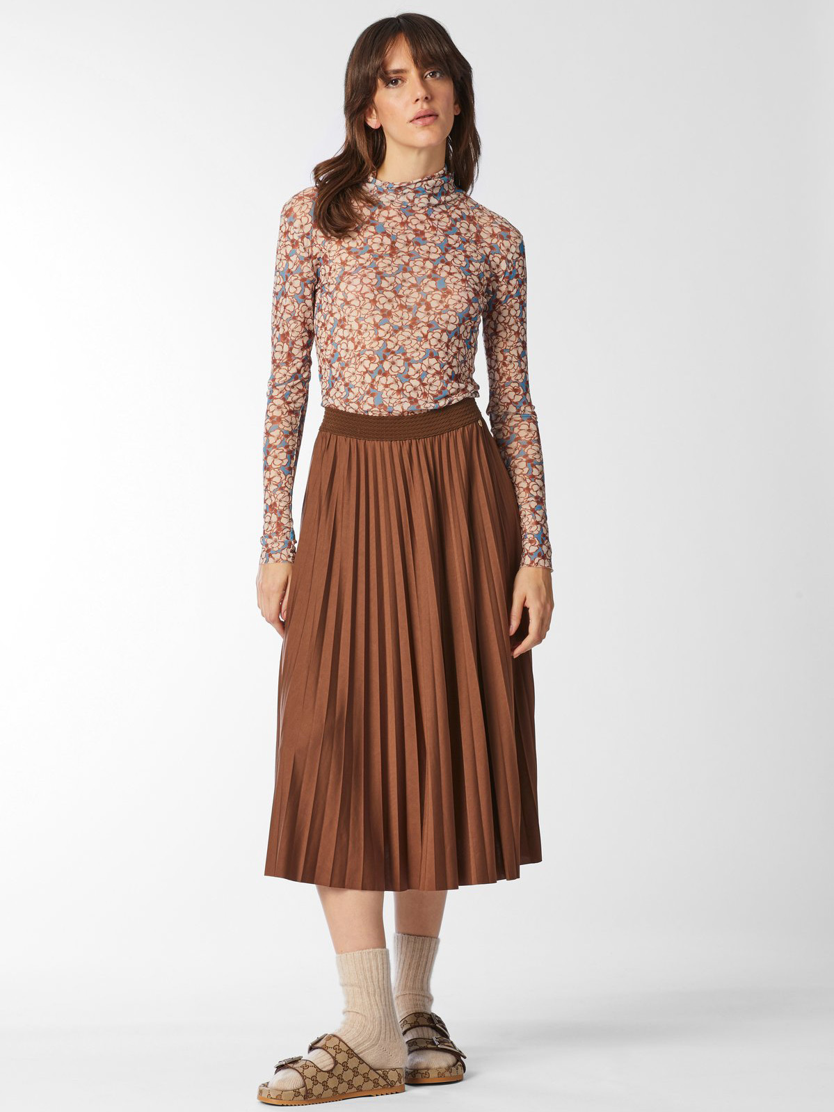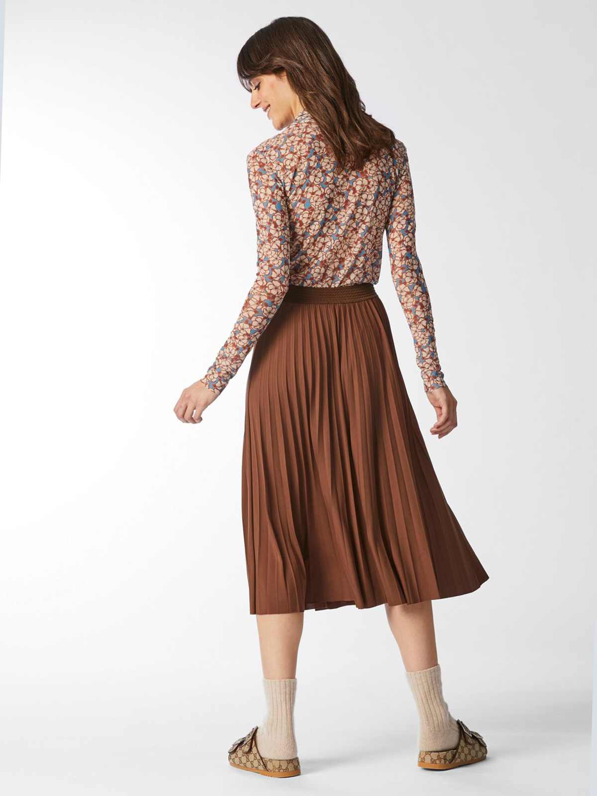 Плиссированная юбка длины миди в базовом коричневом оттенке. Эластичный пояс обеспечивает комфортную посадку по естественной линии талии. Юбка хорошо сочетается с разной обувью как в классическом, так и в спортивном стиле.