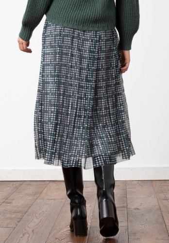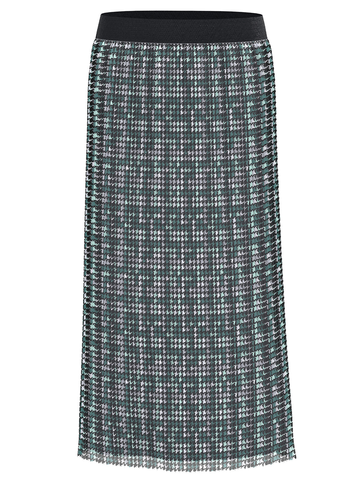 Двуслойная юбка в геометрическом узоре по всей поверхности изделия выполнена из полупрозрачного материала. Длина миди, комфортная посадка по естественной линии талии. Эластичный пояс обеспечивает комфортное ношение.