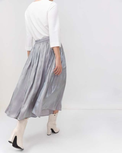 Юбка миди универсального А-силуэта подойдет как для повседневного, так и для праздничного образа. Выполнена из ткани с металлическим отливом. Материал подкладки – вискоза с добавлением эластана. Эластичный пояс обеспечивает комфортную посадку и удобство ношения.