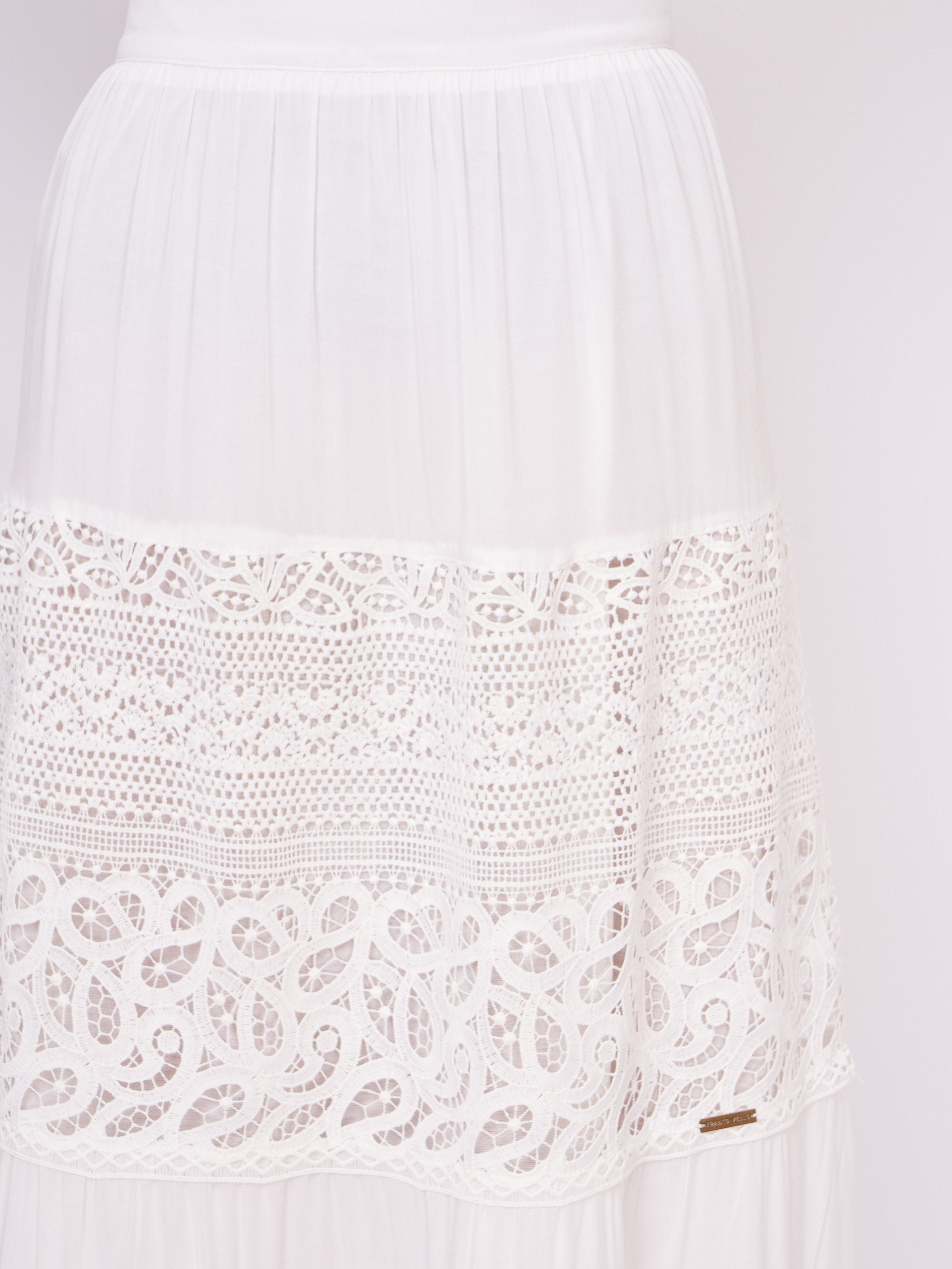На сайте указаны российские размеры. Текстильная белая макси юбка трапеция на молнии, с кружевными вставками, с воланами. Длина юбки: 97 см. Рост модели: 177 см.