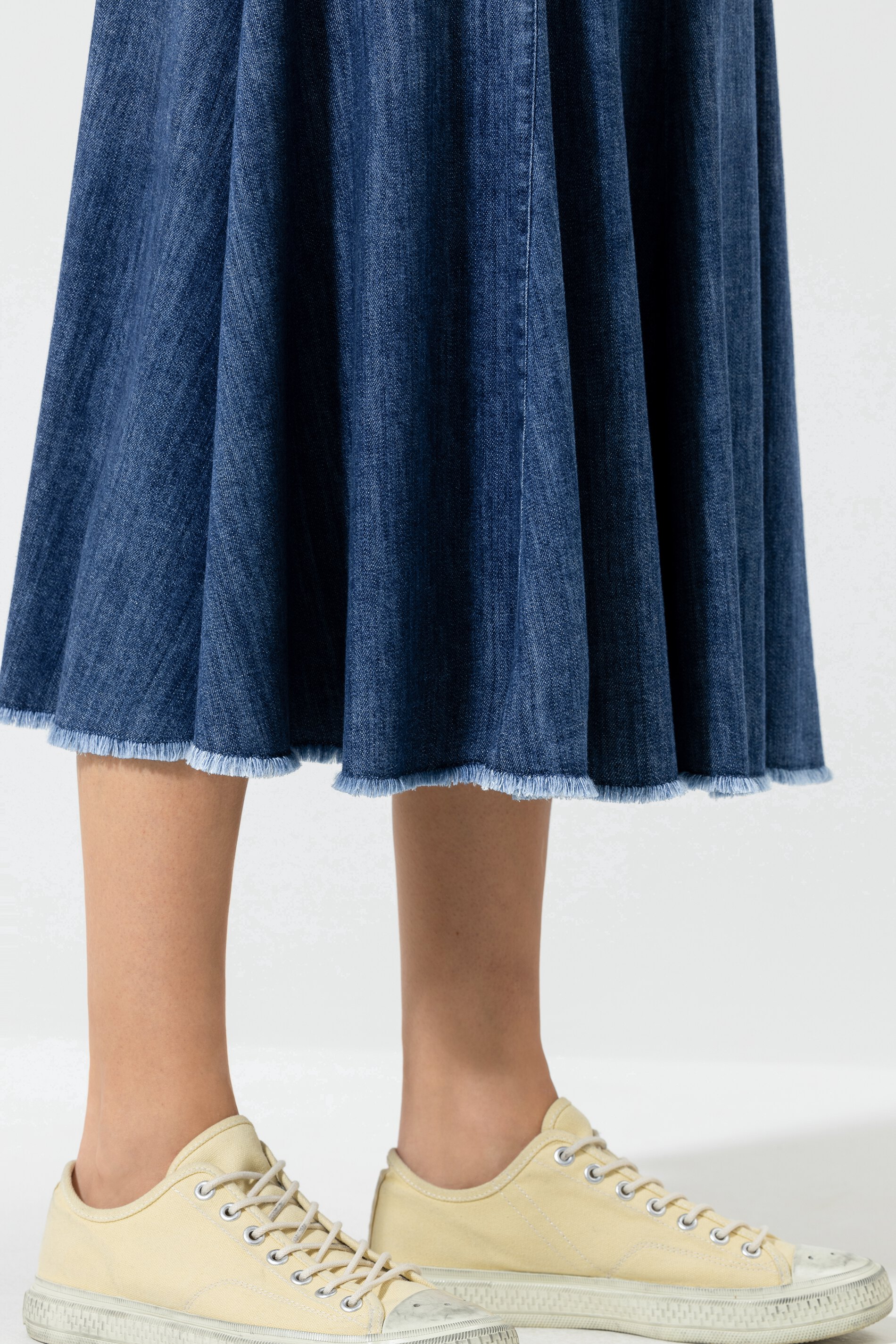 На сайте указаны российские размеры. Юбка-годе средней длины из натуральной легкой эластичной джинсовой ткани с эффектом потертости и молнией сзади. Нижний край украшен тонкой бахромой. Рост модели 178 см