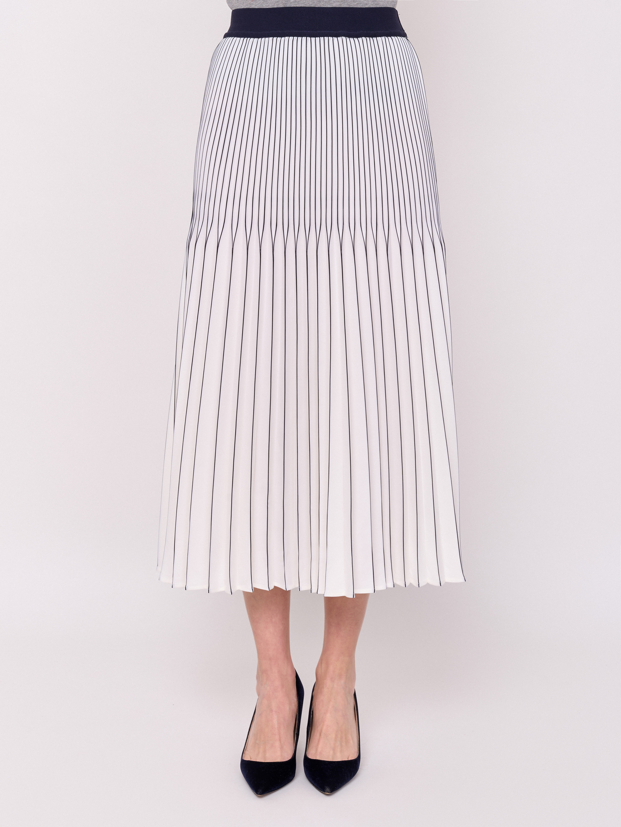 Детали: без застежки, покрой расклешенный, посадка средняя, рисунок полоска, без карманов, конструктивные элементы гофре, модель юбки гофрированная, длина юбки миди. Длина по спинке: 83 см.