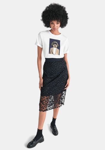 Юбка-миди с замысловатой объемной цветочной вышивкой, которая поднимет вам хорошее настроение. Юбка-комбинация прямого кроя изготовлена из тонкого черного тюля, который в сочетании с синими объемными цветами создает красивый глубокий синий цвет.
