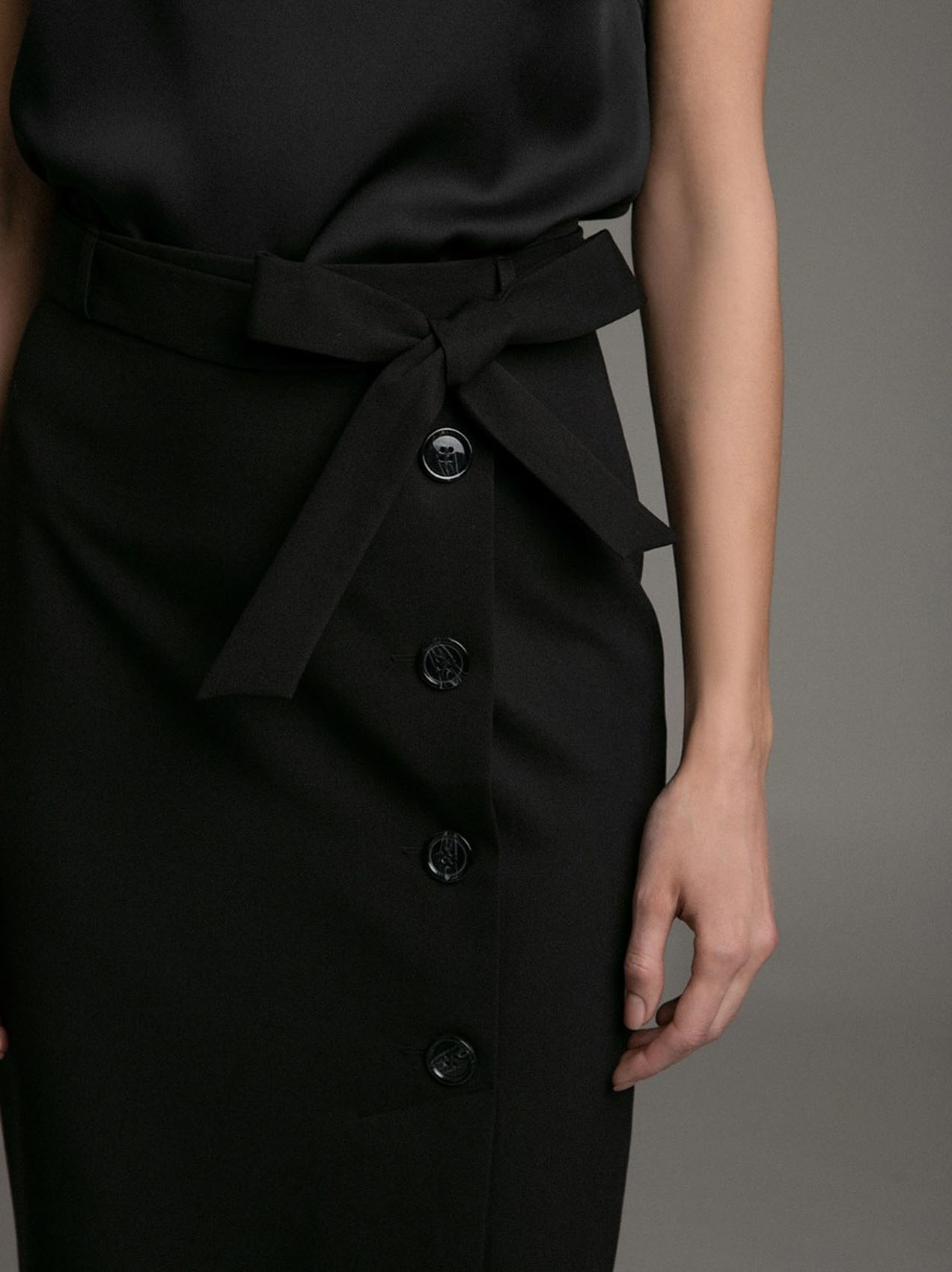 Пуговицы в тренде. Вариация на тему юбка-карандаш. Пуговицы спереди делают модель маст-хэв сезона, а пояс в форме банта создает дополнительный акцент на талии и придает женственности строгому силуэту.