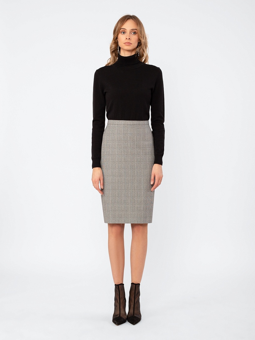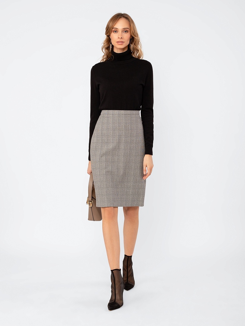 Классическая юбка прямого силуэта, длина до середины колена, на подкладке. Застежка на молнию. На пртиачном поясе. Сзади шлица.
