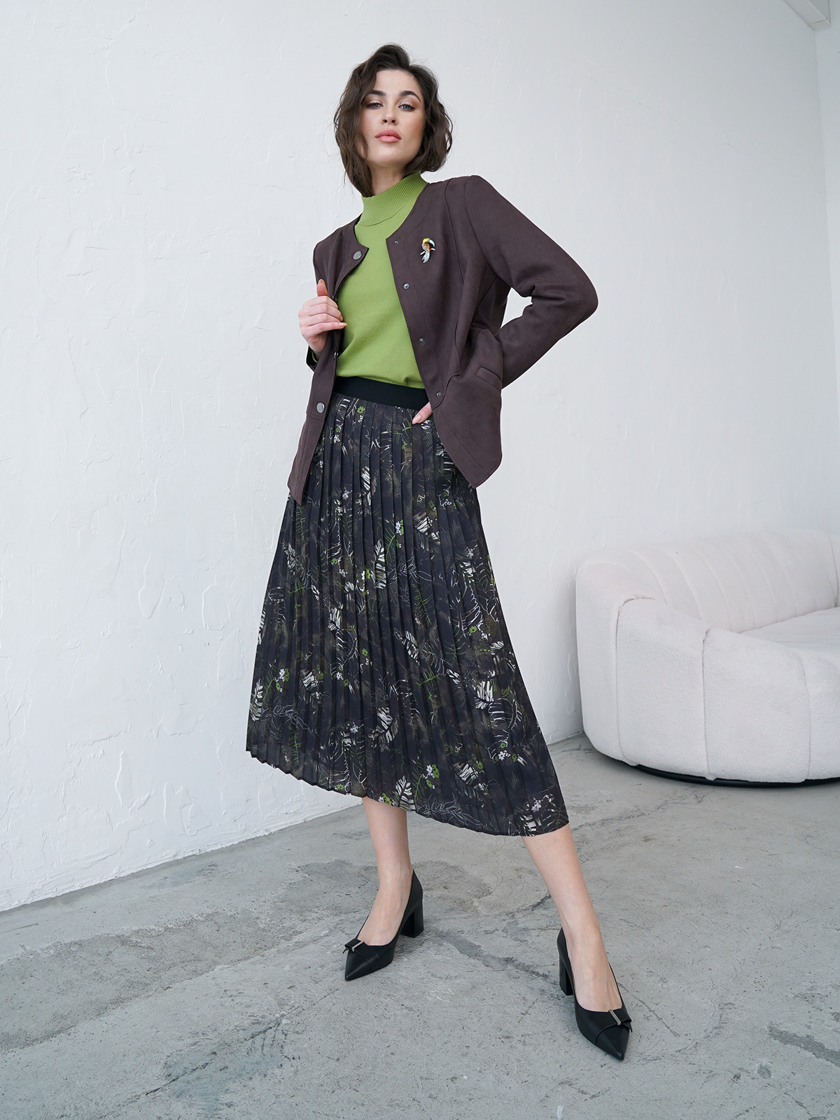 Однотонный жакет насыщенного шоколадного оттенка. Овальный вырез горловины, воротник отсутсвует. Застежка на кнопки, длинный втачной рукав, боковые прорезные карманы с листочкой.