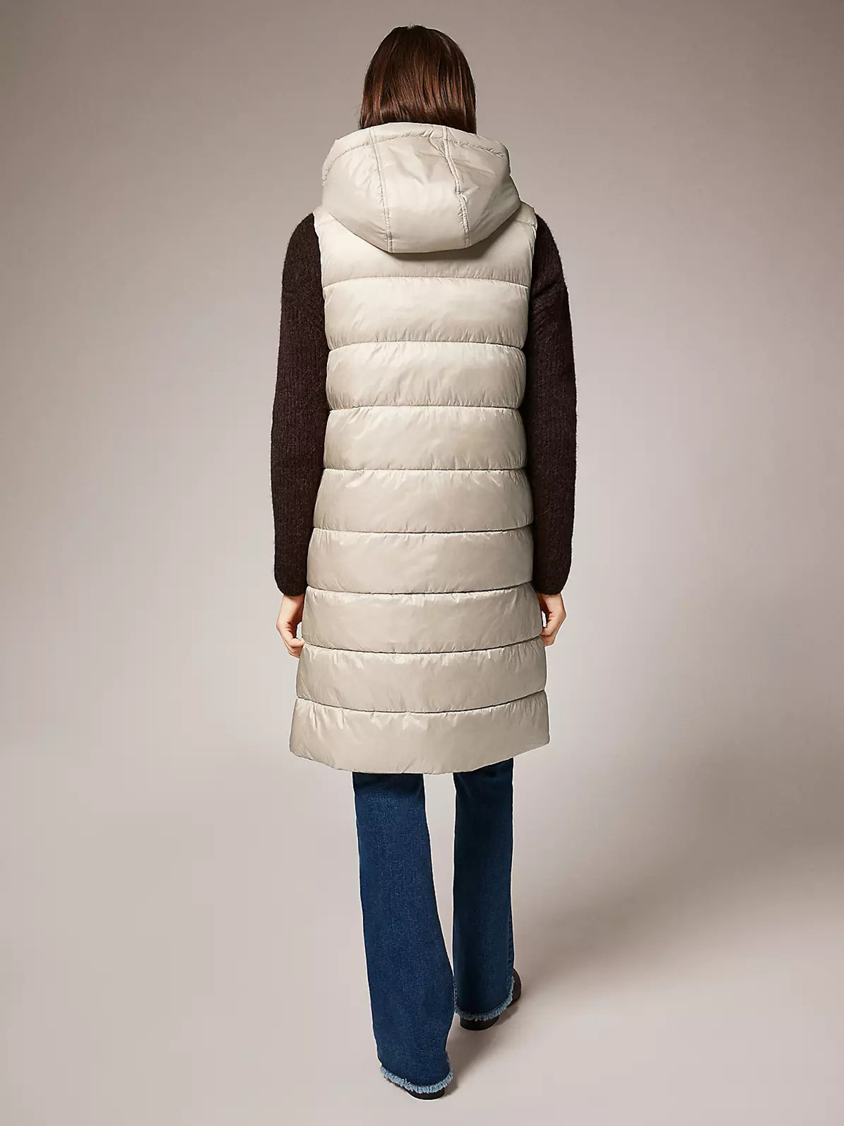 Удлиненный стеганый жилет базового оттенка – теплый и стильный элемент аутфита. Подойдет для образов в спортивном или повседневном стиле, а также для образов спорт-шик. Застежка на молнию и клепки. Объемный капюшон защищает от ветра.
